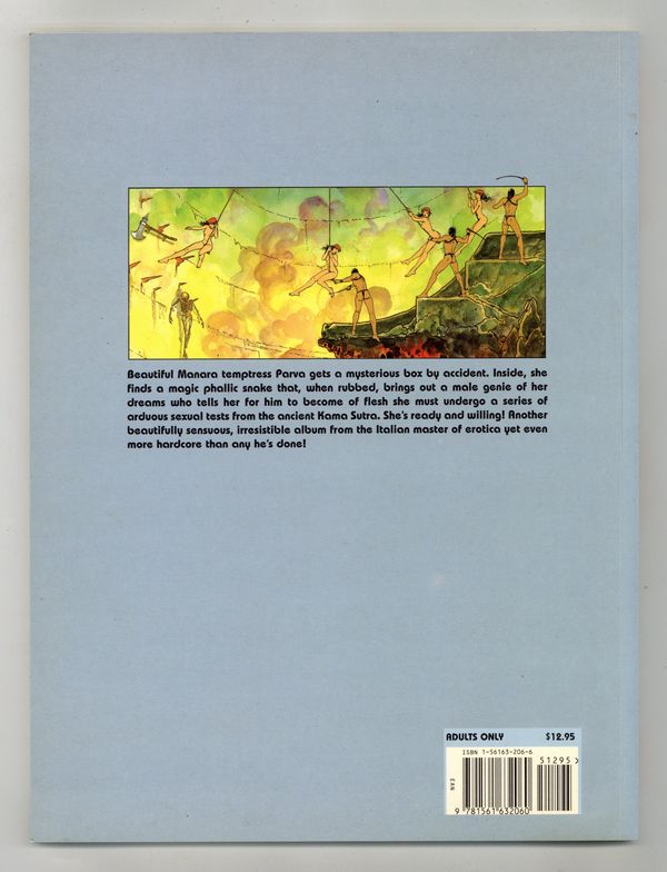 $50.002nd or later printing. Story and art by Milo Manara. Beautiful Manara temptress Parva gets a mysterious box by accident. Inside, she finds a magic phallic snake that, when rubbed, brings out a male genie of her dreams who tells her for him to become of flesh she must undergo a series of arduous sexual tests from the ancient Kama Sutra. She's ready and willing! Another beautifully sensuous, irresistible album from the Italian master of erotica yet even more hardcore than any he's done! Softcover, 8 1/2-in. x 11-in., 68 pages, full color. Mature Readers Cover price $12.95.