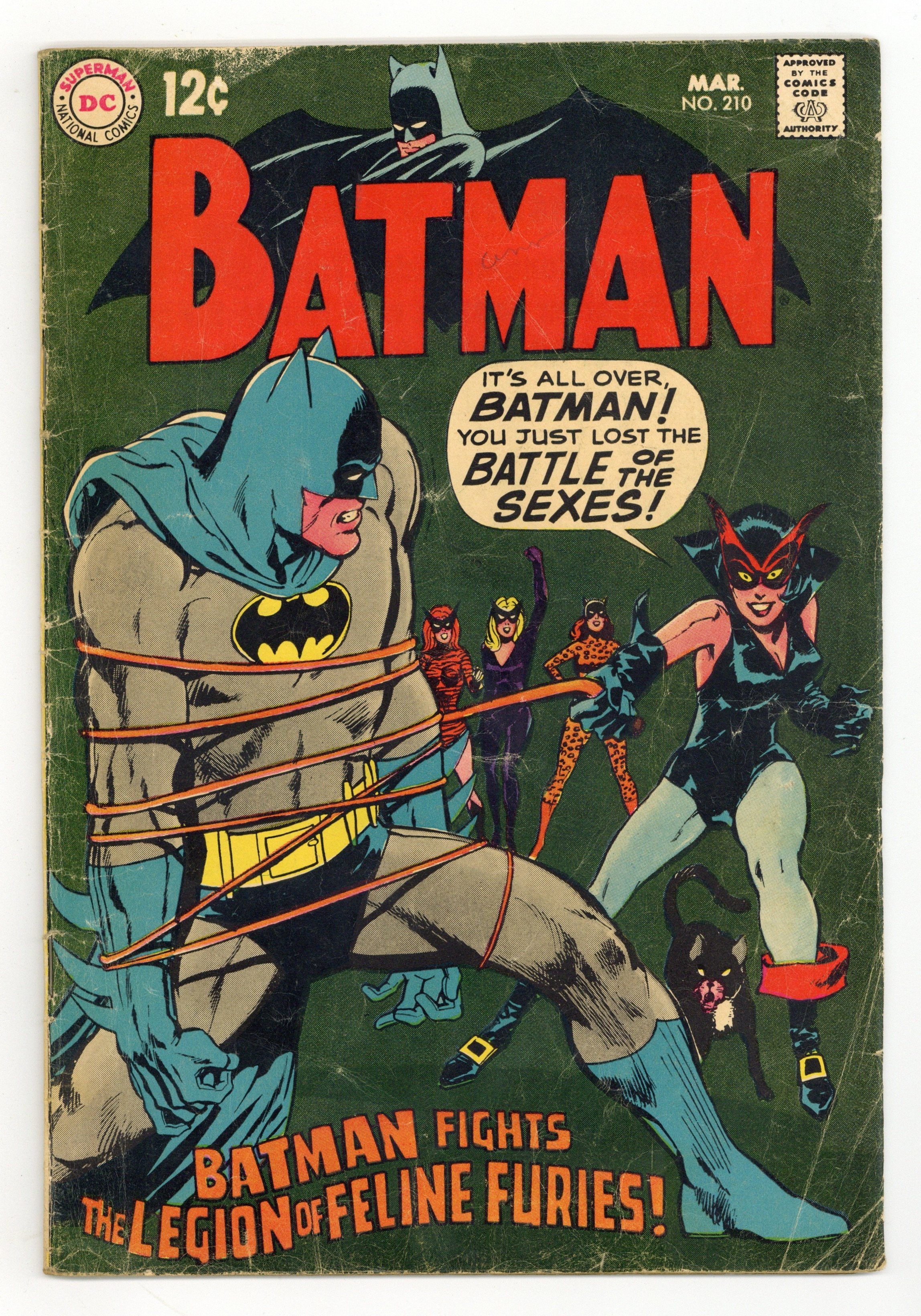 Cover by Neal Adams. "The Case of the Purr-loined Pearl!", script by Frank Robbins, pencils by Irv Novick, inks by Joe Giella; After being released from jail, Catwoman begins a a weight-reducing salon as Selina Kyle; She offers crash-reducing courses to eight women released from the Women's House of Detention; Catwoman defeats them in combat and gives them Catwoman costumes; That night Batman and Robin catch Catwoman's crooks driving the Catmobile and stealing a valuable pearl. Letter to the editor from comic writer Mark evanier. Statement of ownership--average print run 941,000; average paid circulation 533,450. 36 Pages, Full Color. Cover price $0.12.
