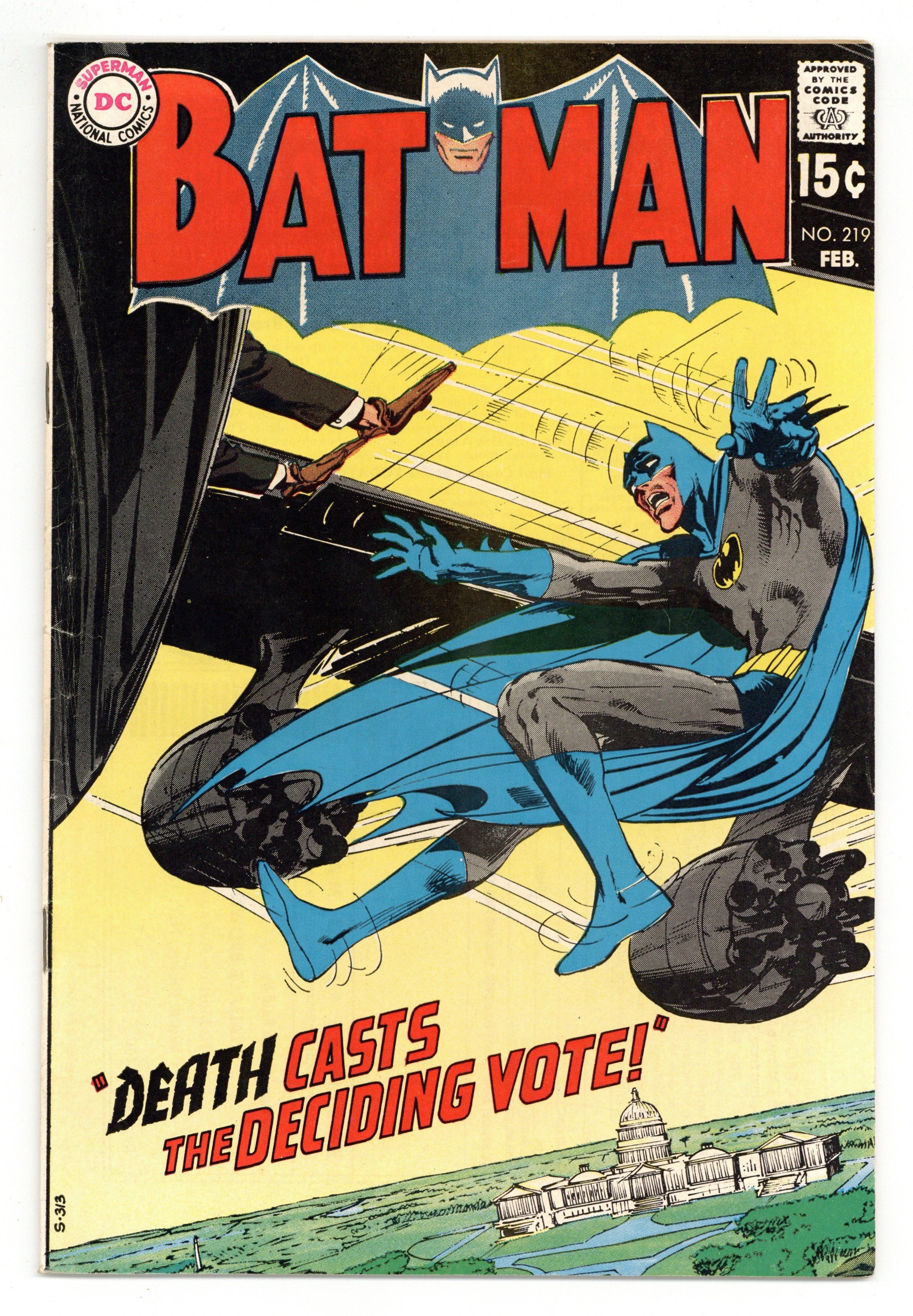 Cover by Neal Adams. "Death Casts the Deciding Vote," script by Frank Robbins, pencils by Irv Novick, inks by Dick Giordano; Batman stops an airplane hijacking and gets a senator to Washington DC in time for a critical vote on an anti-crime bill. "The Silent Night of the Batman," script by Mike Friedrich, pencils by Neal Adams, inks by Dick Giordano; A peaceful night in Gotham allows Batman to spend time with James Gordon. Reprint fantasy story: "Time to Kill!", script by Jack Miller, art by John Giunta; Jed Bruno travels to the future to get revenge on his enemy. Letter to the editor from inker Klaus Janson. 36 Pages, Full Color. Cover price $0.15.