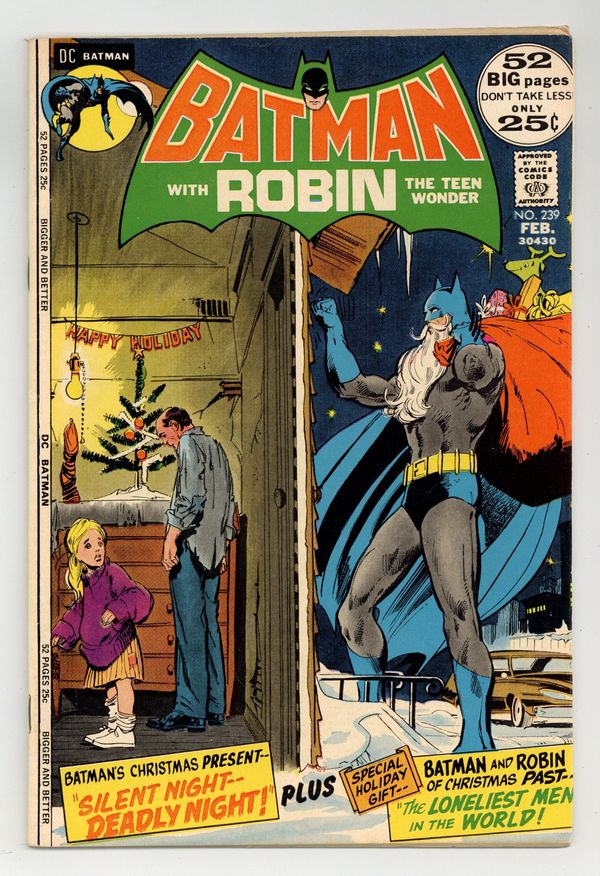 52-page giant. Cover pencils by Neal Adams, inks by Dick Giordano. "Silent Night, Deadly Night!", script by Denny O'Neil, pencils by Irv Novick, inks by Dick Giordano; On Christmas Eve, Batman tracks down a thug who wants revenge on his former boss. A Christmas tale originally presented in Batman #15, "The Loneliest Men in the World," script by Don Cameron, pencils by Bob Kane, inks by Jerry Robinson; For this Christmas, Batman and Robin decide to play Santa to "the loneliest men in the world": those who have no friends at that festive time of the year. But criminal Dirk Dagner decides to use this plan for his own financial advantage! "Soul-Pit!", script by Mike Friedrich, pencils by Rich Buckler, inks by Dick Giordano; Robin and his friends get in a fight with some "Jesus freaks" and then Robin is contacted by Terri Bergstrom that he needs to help Rick Asher. 52 Pages, Full Color. Cover price $0.25.