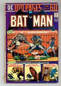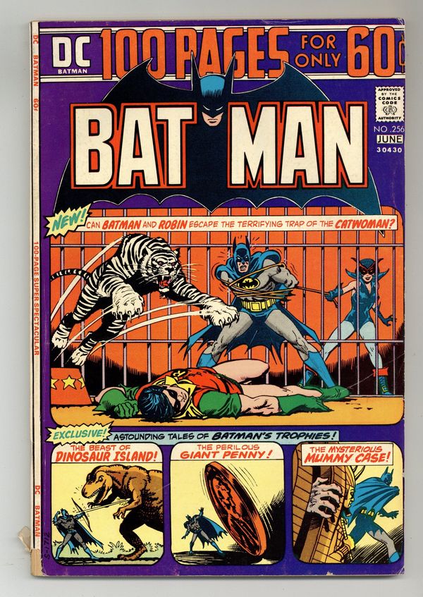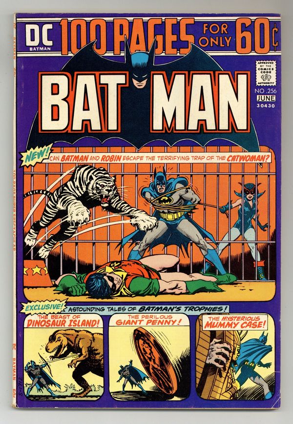 100-page giant. Cover by Nick Cardy. Ever wonder where Batman got those wonderful trophies for the Bat-Cave from? Well, this exciting issue answers that questions and tells the tales of Batman's trophies. "Catwoman's Circus Caper!", script by Denny O'Neil, pencils by Irv Novick, inks by Dick Giordano; When Bruce discovers that Dick has left Hudson University to investigate some mystery at the Tip-Top Circus, Batman decides to join the Teen Wonder to investigate a murder at the circus. "Dinosaur Island!", script by Bill Finger, pencils by Paul Cooper (as Bob Kane), inks by Ray Burnley; Batman and Robin are challenged to a game of "Touch Hunt" on famed Dinosaur Island in return for a gift to charity in the amount of $5000...if they win the game. "The Penny Plunderers!", script by Bill Finger, pencils by Bob Kane, inks by Ray Burnley; Throughout his life, Joe Coyne felt threatened, done in by pennies and coppers, so he decides to use the "copper penny" as a trademark of his crimes. "Brothers in Crime!", script by Don Cameron, pencils by Jerry Robinson, inks by Jerry Robinson and George Roussos (backgrounds); While visiting their trophy room, the Caped Crusaders come across a bullet-proof vest, a keepsake from a case involving the Rafferty Brothers, who unwittingly implicated their brother Peter in a murder. "The Thousand and One Trophies of Batman!", script by Edmond Hamilton, pencils by Bob Kane, inks by Charles Paris; As they add trophy 1000 to the Bat-Cave's collection, the Caped Crusaders decide to check over the other trophies to make sure they are in good shape; The evil Dr. Doom is hiding inside and plans to rig some of the trophies in the Bat-Cave to kill the Dynamic Duo. "The Secret of Batman Island!" script by Bill Finger, pencils by Sheldon Moldoff (as Bob Kane), inks by Charles Paris; The founder/owner of Batman Island is followed home by criminals seeking films the man has been shooting that could finger them for a crime they committed. The Catwoman! character profile. 100 Pages, Full Color. Cover price $0.60.