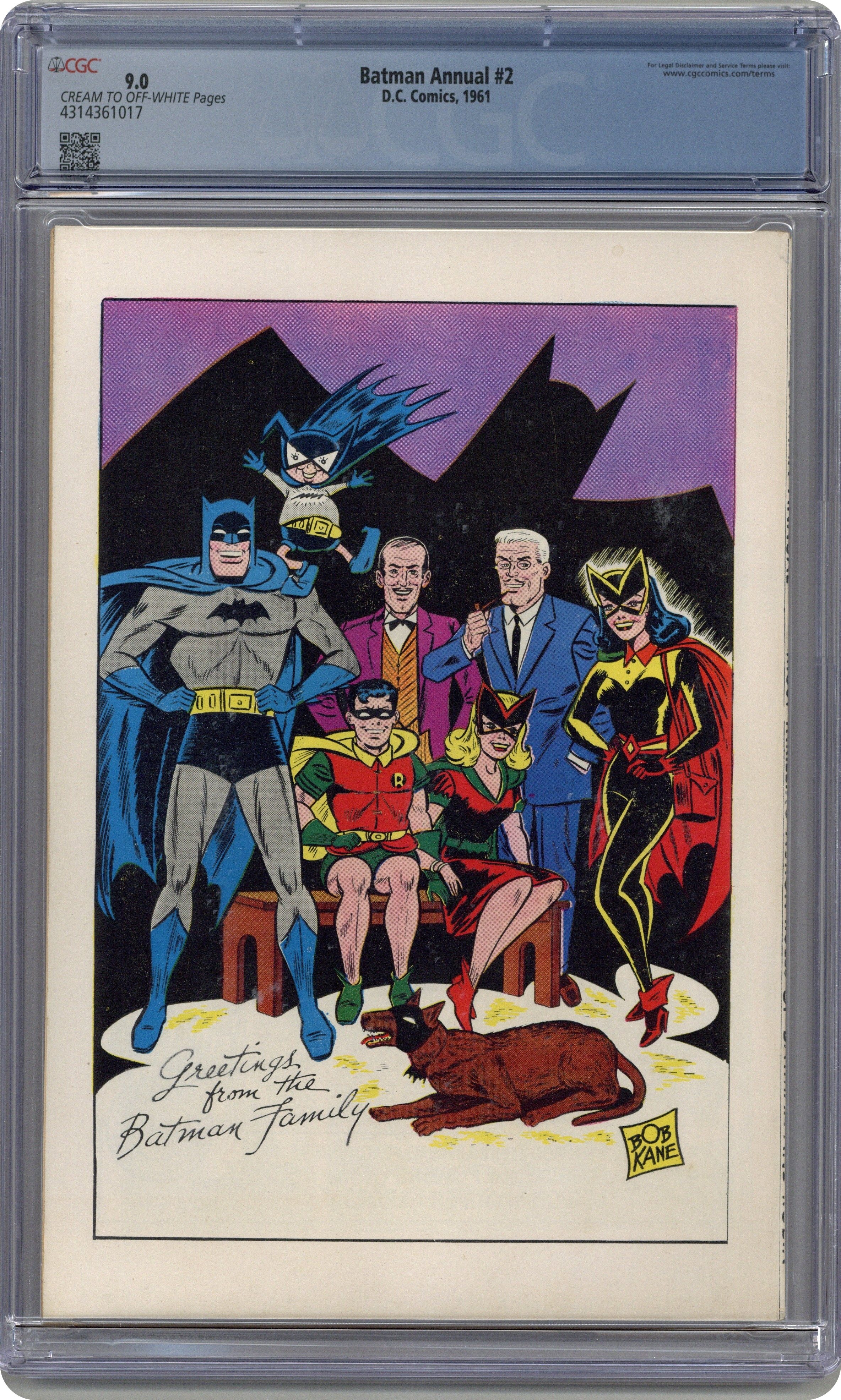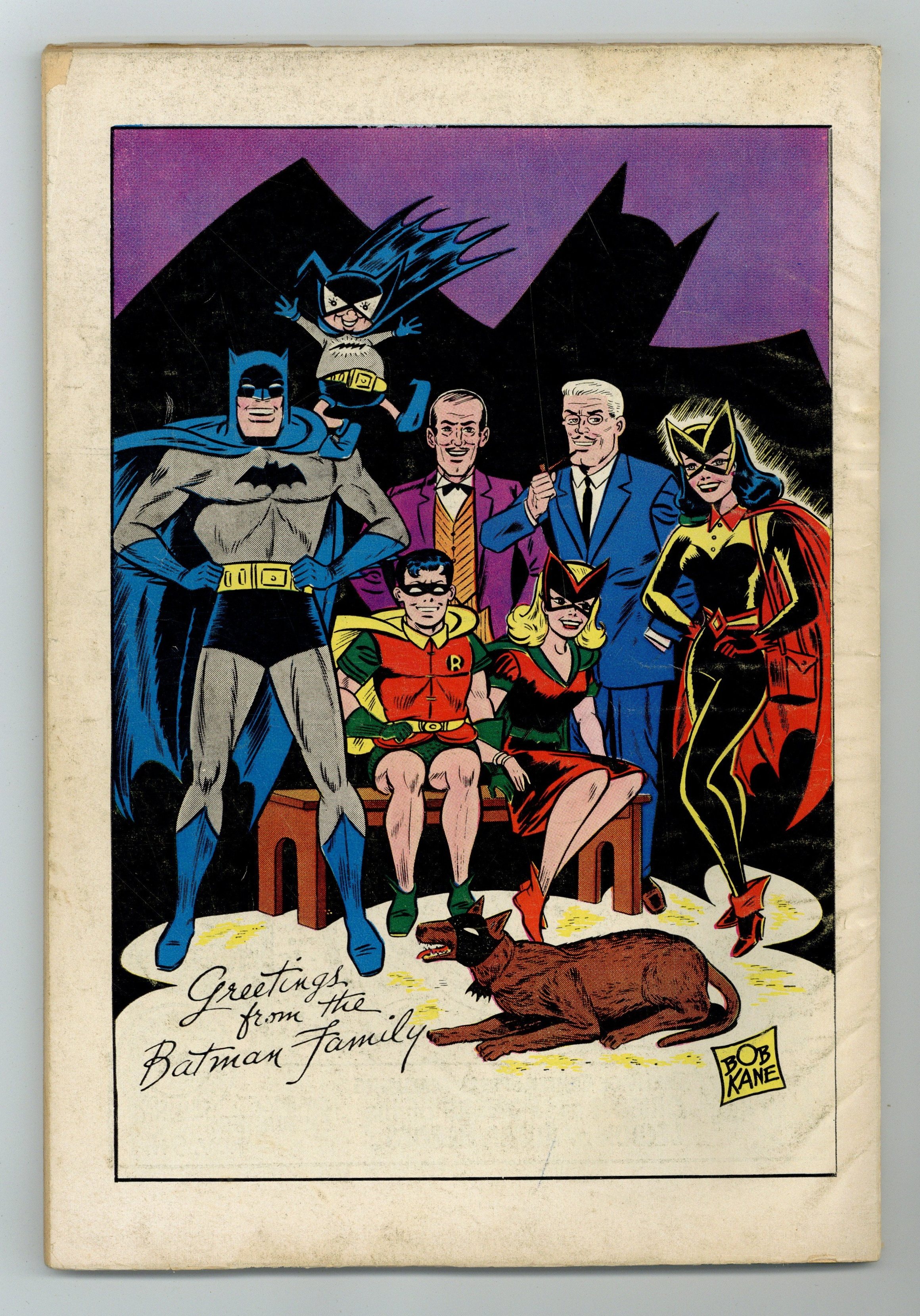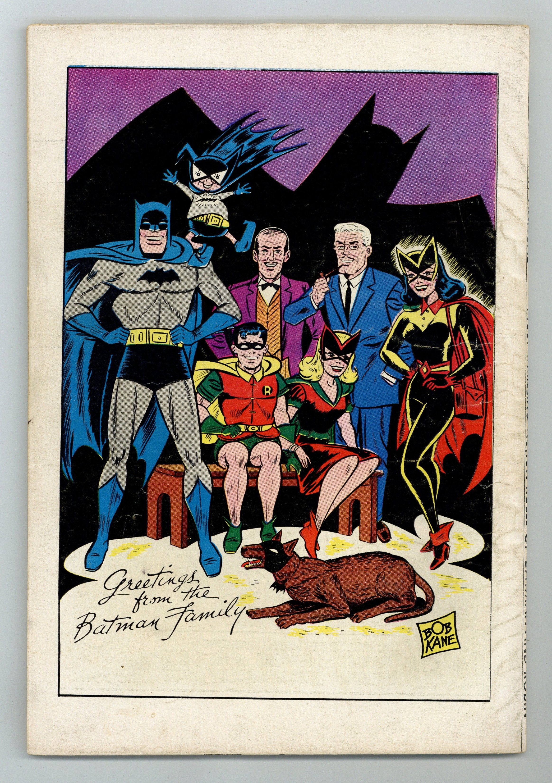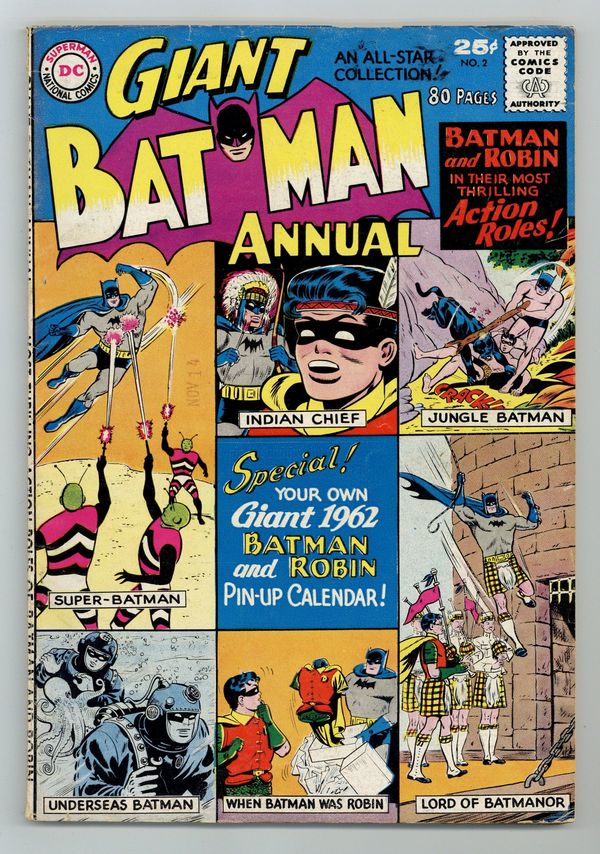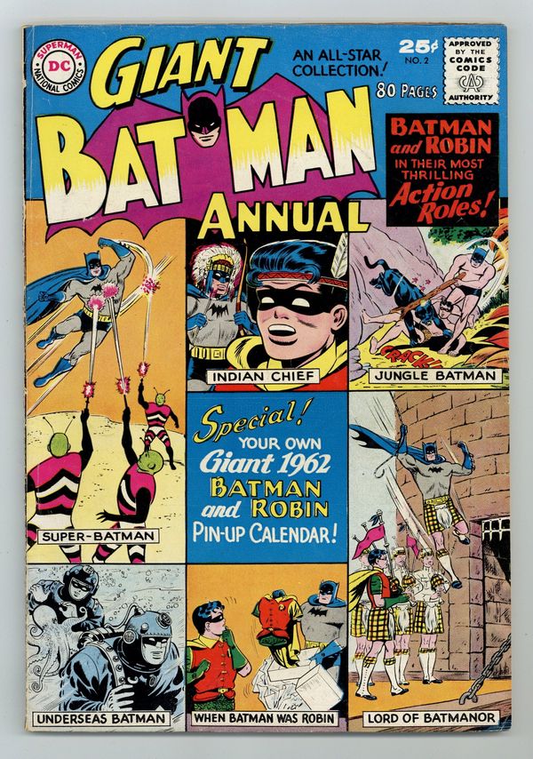 All reprints. Cover pencils by Curt Swan, Sheldon Moldoff, and Dick Sprang, inks by Charles Paris. "The Undersea Batman," script by Edmond Hamilton, pencils by Dick Sprang, inks by Charles Paris; Batman risks death from the "bends" if he does not regulate his decrompression rate after an underwater mission; "Slant" Stacy takes advantage of the situation. "The Lord of Batmanor!", script by Edmond Hamilton, pencils by Dick Sprang, inks by Charles Paris; Scottish Laird of Batmanor, Angus McLaughlie, bequeaths his castle to Batman in the hope that the famed detective will solve a 400 years old mystery involving the King's gold. "Batman--Indian Chief!", script by Ed (France) Herron, pencils by Sheldon Moldoff, inks by Charles Paris; Out over the mountains, the Dynamic Duo spot a smoke signal in the shape of a bat; Upon further investigation they meet Sioux Indians, Great Eagle and his son Little Eagle. "The Jungle Batman!", script by David Vern, pencils by Lew Sayre Schwartz, inks by Charles Paris; Batman and Robin are assigned to escort a group of criminals, the Sinister 8, to Satan Island prison. 1962 Batman and Robin Calendar. "When Batman Was Robin," script by Edmond Hamilton, pencils by Dick Sprang, inks by Charles Paris; When Bruce Wayne receives a package from Master Detective Harvey Harris, he realises that mistakes made in his past could reveal his secret identity in the present. "Batman the Magician!", script by Bill Finger, pencils by Sheldon Moldoff, inks by Charles Paris; When Merko the Great, a stage magician, is abducted during the interval of a charity show, Batman assumes his identity and improvises ways to perform his act. "Batman -- the Superman of Planet X!", script by Ed (France) Herron, pencils by Dick Sprang. Pinup of the Batman Family on back cover. 84 pgs., full color. Cover price $0.25.