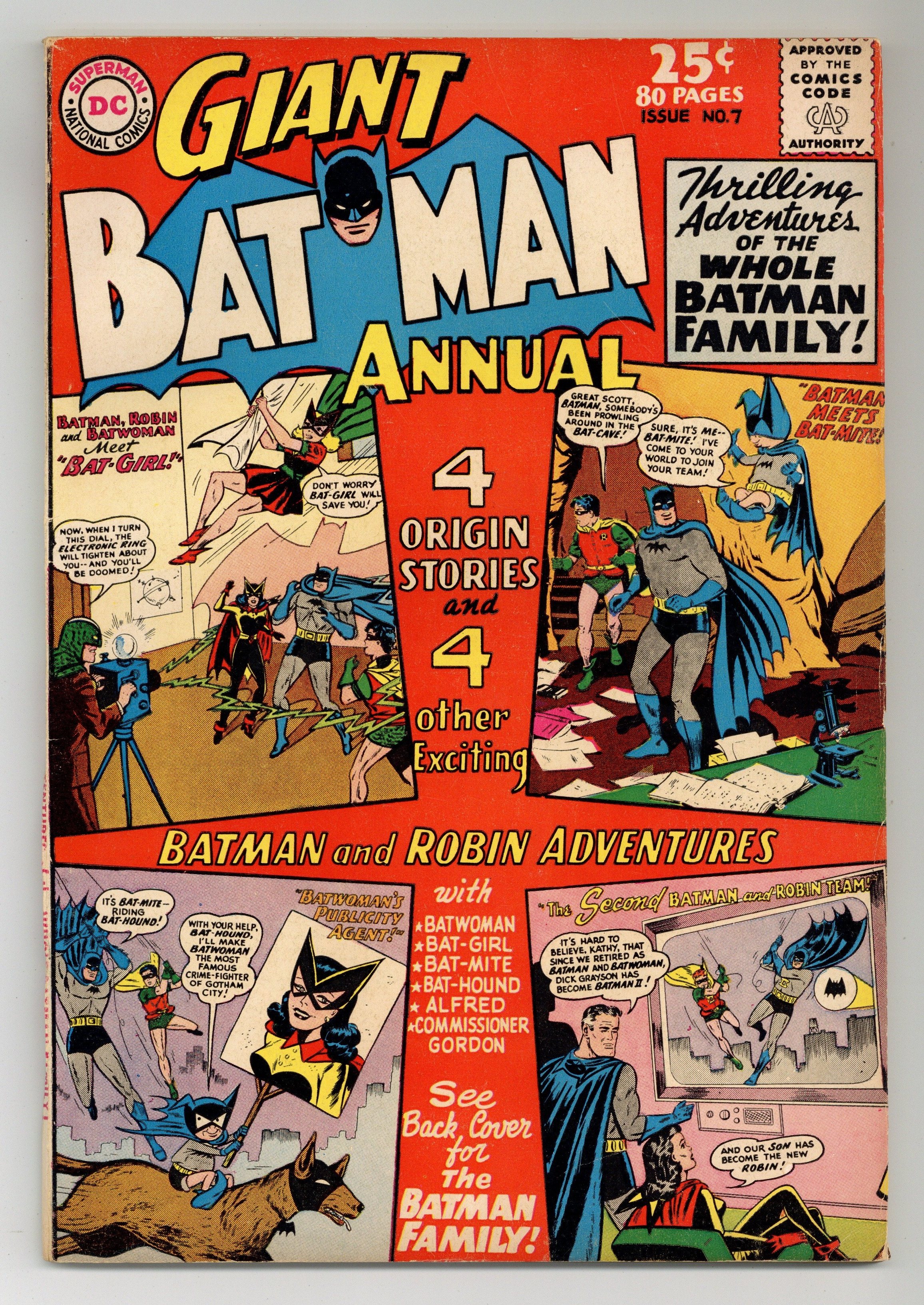Summer 1964. All reprints, featuring four origin stories. Cover pencils by Sheldon Moldoff and Curt Swan, inks by Sheldon Moldoff and Stan Kaye. "Batman Meets Bat-Mite," script by Bill Finger, pencils by Sheldon Moldoff (ghost for Bob Kane), inks by Charles Paris; Bat-Mite, an elf-like being from another dimension appears in the Bat-Cave, he sets about "helping" Batman and Robin with his magical powers. "The Secret Life of Bat-Hound," script by Bill Finger, pencils by Sheldon Moldoff (ghost for Bob Kane), inks by Charles Paris; When Batman and Robin are trapped by Mr. Midas in a collapsed mine, Bat-Hound alerts Batwoman and the foursome tackle the Midas Mob. "Bat-Girl," script by Bill Finger, pencils by Sheldon Moldoff (ghost for Bob Kane), inks by Charles Paris; Betty Kane deduces that her Aunt Kathy is secretly Batwoman and assumes the identity of Bat-Girl. "The Dynamic Trio," script by Edmond Hamilton, pencils by Sheldon Moldoff (ghost for Bob Kane), inks by Charles Paris; The Dynamic Duo become the Dynamic Trio when they team up with Mysteryman, but Vicki Vale is determined to uncover the newcomer's real identity. "The Secret of Batman's Butler," script by Bill Finger, pencils by Sheldon Moldoff (ghost for Bob Kane), inks by Charles Paris; A mistake by Alfred when he first became the Wayne butler causes him to consider resigning his position years later. "The New Team of Superman and Robin," script by Bill Finger, pencils by Curt Swan, inks by Sheldon Moldoff. "Batwoman's Publicity Agent," script by Bill Finger, pencils by Sheldon Moldoff (ghost for Bob Kane), inks by Sheldon Moldoff; Bat-Mite returns and teams up with Batwoman but he has not legislated for falling in love with her. "The Second Batman and Robin," script by Bill Finger, pencils by Sheldon Moldoff (ghost for Bob Kane), inks by Charles Paris. 84 pgs., full color. Cover price $0.25.