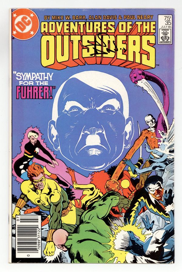 The Outsiders must save Geo-Force's brother, not to mention all of Markovia, in "Sympathy For the Fuhrer!" Part 3 of 3, continued from the previous issue. Script by Mike W. Barr, pencils by Alan Davis, inks by Paul Neary. Masters of Disaster, Baron Bedlam and a certain Fuhrer appear. Davis cover. Cover price $0.75.