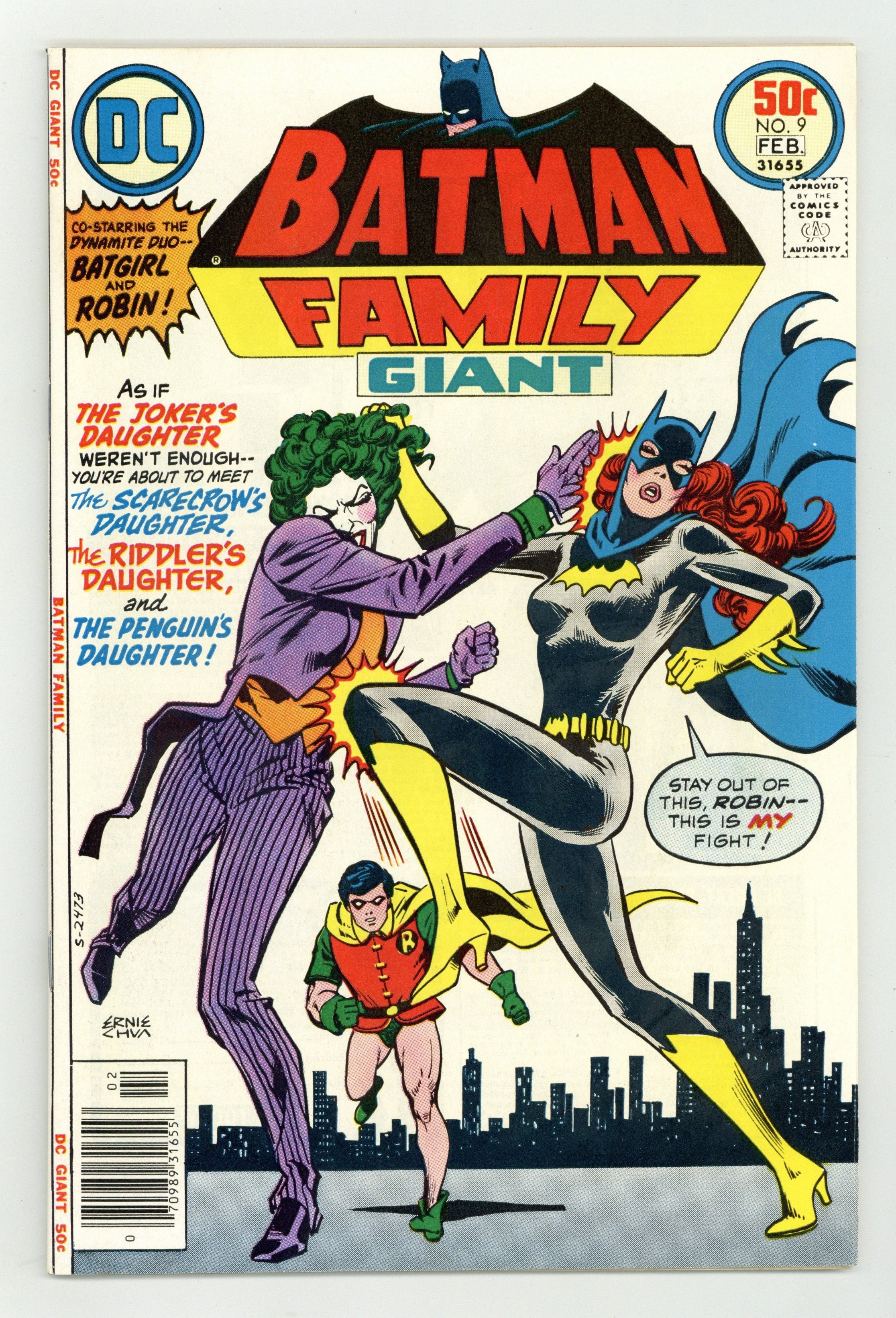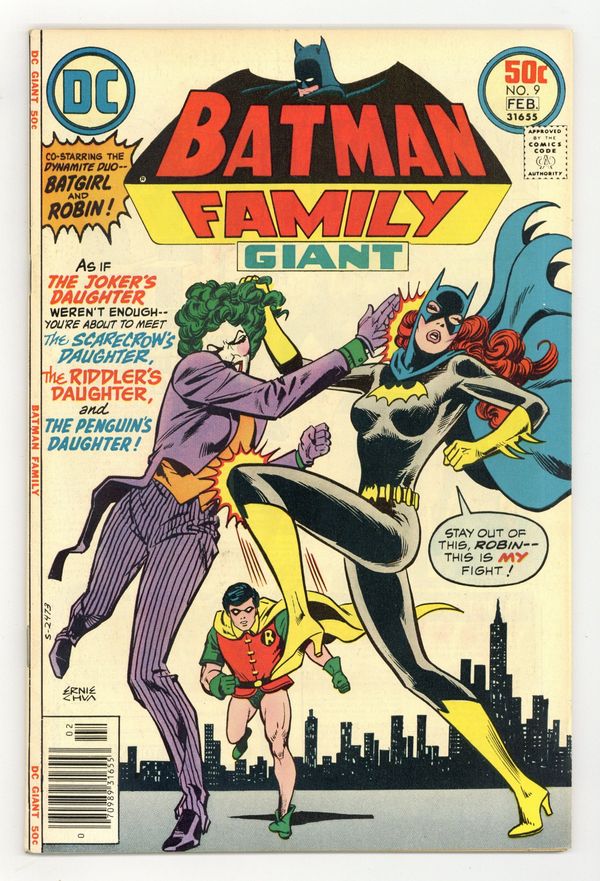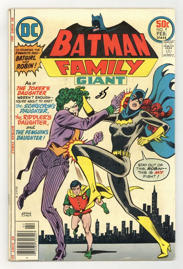 Giant-size issue. Batgirl and Robin have their hands full when they take on the daughters of the Joker, the Scarecrow, the Riddler, and the Penguin in "The Startling Secret of the Devilish Daughters!" Script by Bob Rozakis, pencils by Irv Novick, inks by Vince Colletta. Reprint back-up stories: Alfred stars in "Recipe for Revenge!" (art by Jerry Robinson); Batman and Robin star in "The Blockbuster Breaks Loose!" with script by Gardner Fox, pencils by Carmine Infantino, inks by Joe Giella. Ernie Chan (as "Ernie Chua") cover. 52 pages, full color. Cover price $0.50.