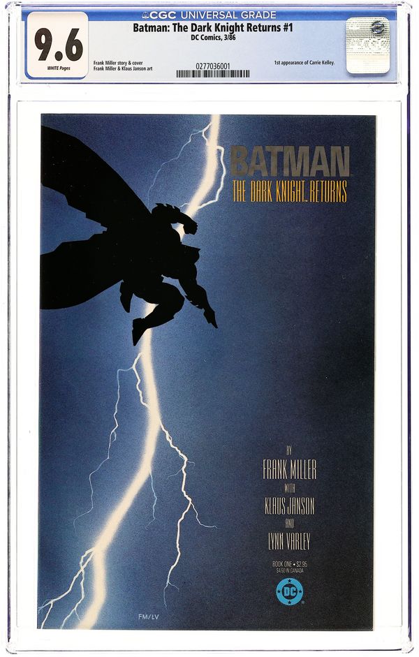 1st printing. NOTE: 2nd, 3rd, and 4th printings of #1 are labeled as such on the inside cover. Cover by Frank Miller. "The Dark Knight Returns," script and pencils by Frank Miller, inks by Klaus Janson; Set 20 years in the future, this story finds that in the absence of superheroes, criminals have run amok, and a gang called the Mutants are terrorizing Gotham City; Bruce Wayne has been retired from super-heroing for 10 years following the death of Jason Todd, the second Robin; Despite Wayne's funding of the rehabilitation of Harvey Dent (Two-Face), Dent returns to being a super-villain; Bruce, overcome with the grief over what Gotham has become, dons the Batman costume again and captures Dent. 52 pgs., full color. Cover price $2.95.