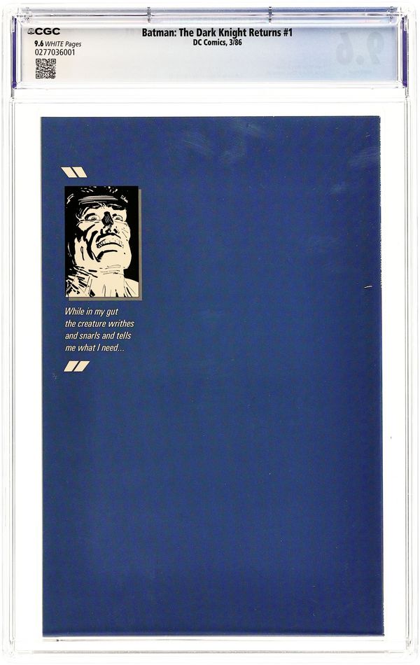 Tags: Batman$115.001st printing. NOTE: 2nd, 3rd, and 4th printings of #1 are labeled as such on the inside cover. Cover by Frank Miller. "The Dark Knight Returns," script and pencils by Frank Miller, inks by Klaus Janson; Set 20 years in the future, this story finds that in the absence of superheroes, criminals have run amok, and a gang called the Mutants are terrorizing Gotham City; Bruce Wayne has been retired from super-heroing for 10 years following the death of Jason Todd, the second Robin; Despite Wayne's funding of the rehabilitation of Harvey Dent (Two-Face), Dent returns to being a super-villain; Bruce, overcome with the grief over what Gotham has become, dons the Batman costume again and captures Dent. 52 pgs., full color. Cover price $2.95.