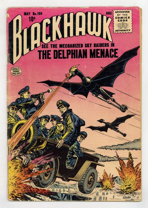 Cover by Dick Dillin and Chuck Cuidera. Stories by Joe Millard, Robert Bernstein and unknown. Art by Dick Dillin, Chuck Cuidera, Sam Citron and unknown. Featuring Blackhawk in: "The Delphian Menace" by Joe Millard, Dick Dillin and Chuck Cuidera; "The Citadel of Hate" with art by Dillin and Cuidera; "The Steel Scorpion" with story by Millard and inks by Cuidera; and 1-page text story "Sons of the Deluge"! Plus: Back-up story "The Ghost Plane" by Robert Bernstein and Sam Citron. 36 Pages, Full Color. Cover price $0.10.