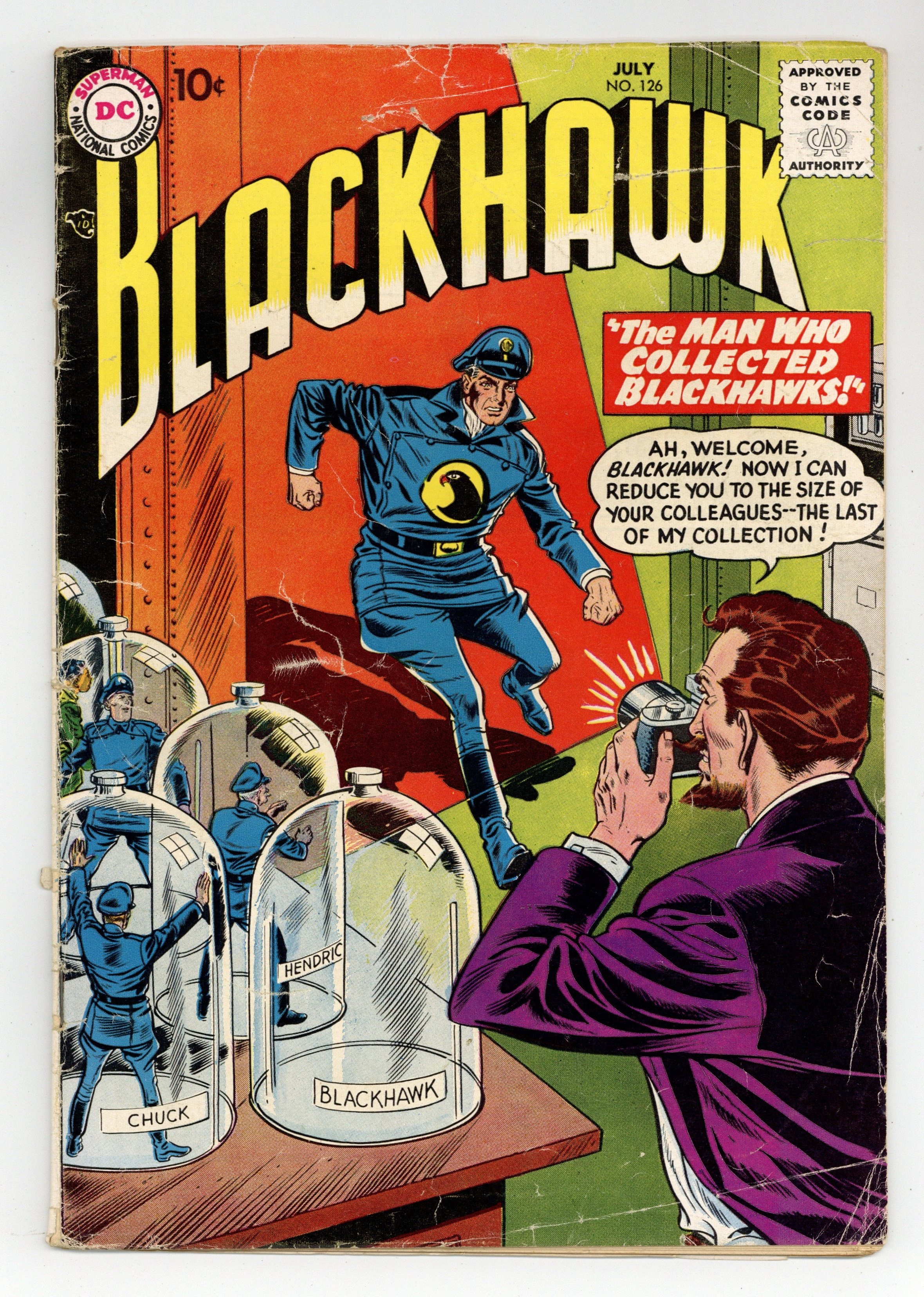 Cover by Dick Dillin and Charles Cuidera. Featuring: 8 page Blackhawk story "The Secret of the Glass Fort" drawn by Dick Dillin and Charles Cuidera; 8 page Blackhawk story "Hendrickson, King for a Day" drawn by Dick Dillin and Charles Cuidera; 2 page reprint story "Pike's Peak Gold Rush" written by Gardner Fox and drawn by Irwin Hasen & Bob Lander; 8 page Blackhawk story "The Man Who Collected Blackhawks" drawn by Dick Dillin and Charles Cuidera. Cover price $0.10.