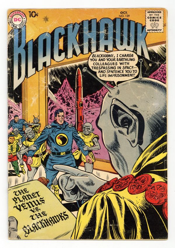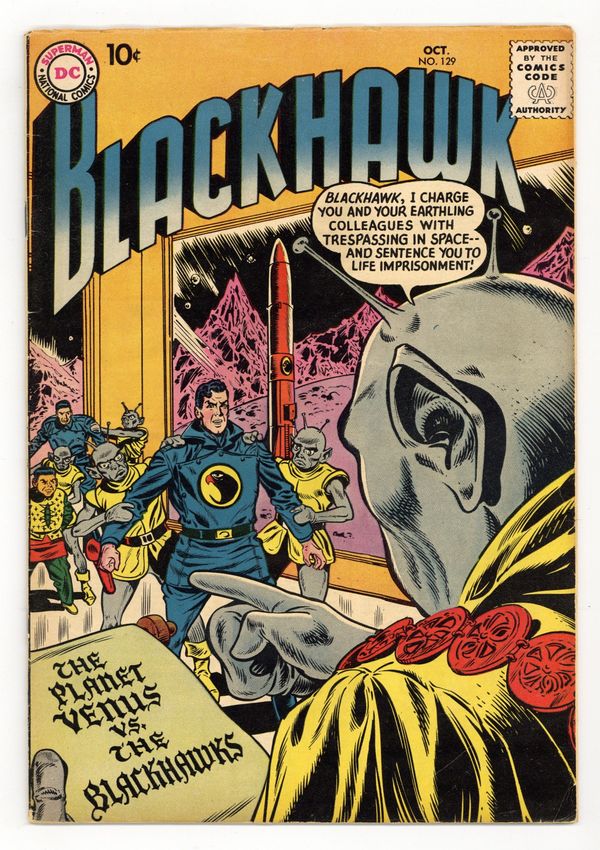 Stories by unknown. Art and Cover by Dick Dillin & Charles Cuidera. Three stories! "The Planet Venus vs. the Blackhawks" - Blackhawk and his Earthling colleagues are charged with trespassing in space...and sentenced to life imprisonment! Also featuring: "The Caveman from 30,000 B.C." and "The Last Blackhawk"! Plus: 1-page text article "Return of the Rogues"! 32 pages, full color. Cover price $0.10.
