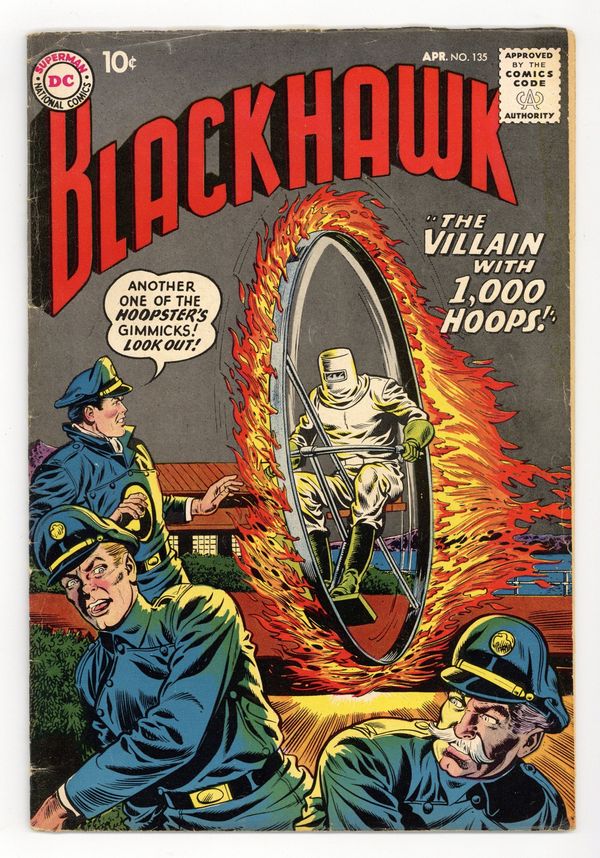 Cover by Dick Dillin & Charles Cuidera. Stories by unknown. Art by Dick Dillin, Charles Cuidera and Sheldon Moldoff. Three stories! "The Underworld Supermart" - The Underworld Supermart supplies guns, ammo, bullet-proof vehicles, and bank blueprints...they've got it all! This week's special is Anti-Blackhawk Weapons -- developed by Buzzer Barton -- good on land, on the sea, or in the air. Plus: "The One-Man Blackhawk Team" - Whenever the Blackhawks are called to handle an emergency, inventor Hector Rye shows up, and through the use of his inventions, escalates the severity of the emergency. And: "The Villain with 1,000 Hoops" - The Blackhawks contend with the Hoopster, master of the gadget laden hoops. Also: 1-page text story "Eyes in the Night"! 32 pages, full color. Cover price $0.10.
