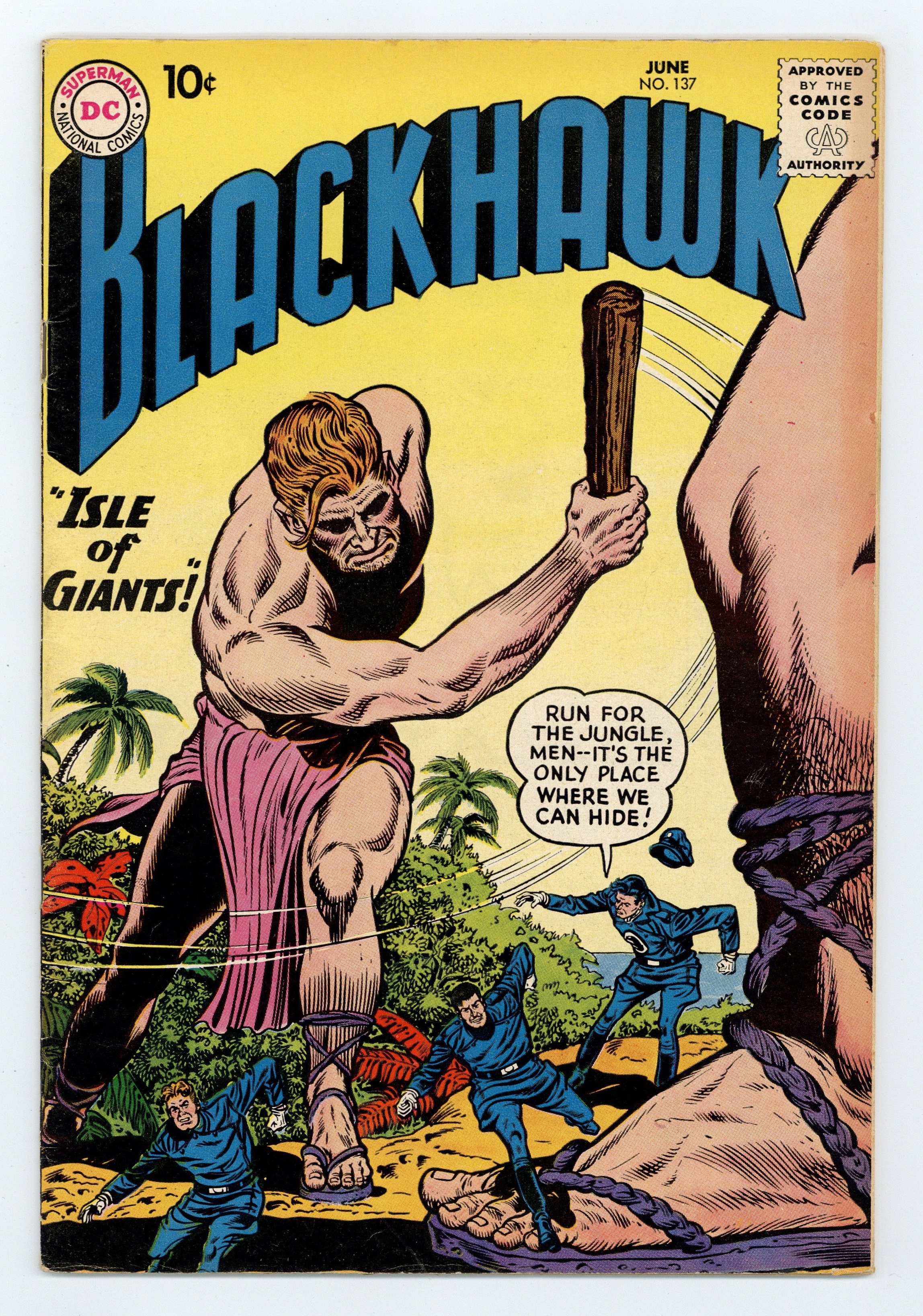 Stories by unknown. Art and Cover by Dick Dillin & Charles Cuidera. Three stories! "The Weapons That Backfired" - Once a year, in conjunction with the 'Inventor's Club,' the Blackhawks test out new inventions that may lend themselves to industrial use, such as the Flying Buzz-Saw, or the Mechanical Caterpillar, or the Radio Man, a giant robot. Hearing reports of strange goings on, a group of reporters discover the testing. Shortly after, the machines are stolen by Baron Kram and his henchmen, who proceed to test the machines in their own way. Plus: "The Invalid Blackhawk" - While stopping a robbery, Blackhawk is injured and must be confined to a wheelchair for a few weeks. But when an ordinary wheelchair won't allow him to continue to lead the team, he has a new wheelchair designed, suitable for the leader of the Blackhawks. And: "The Isle of Giants" - The Blackhawks track Dr. Vokar and his henchmen Hack and Frisco to a Carribean Island. But the three flee into the stormy ocean rather than be captured. When they're shipwrecked on a deserted island, they find that eating the fruit grown there causes them to grow into giants, which the Blackhawks discover when they follow them there. Also: 1-page text story "Decision in the Desert"! 32 pages, full color. Cover price $0.10.