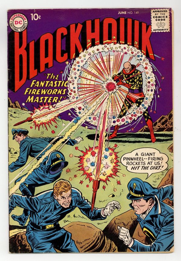 Cover by Dick Dillin & Charles Cuidera. Stories by unknown. Art by Dick Dillin, Sheldon Moldoff and Charles Cuidera. Three stories! "The Fantastic Fireworks Master" - The Blackhawks must hit the dirt when a giant pinwheel starts firing rockets at them! Also featuring: "The Masks of Doom" and "The Marriage of Andre"! 32 pages, full color. Cover price $0.10.