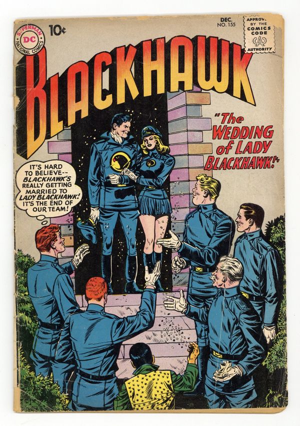 Cover by Dick Dillin & Charles Cuidera. Stories by Dave Wood, Jack Miller and unknown. Art by Dick Dillin, Charles Cuidera and Sheldon Moldoff. Three stories! "Killer Shark's Land Armada" - Killer Shark uses decoys to commit crimes on land. Plus: "The Wedding of Lady Blackhawk" - Zinda and Blackhawk get married, but the rest of the Blackhawks are jealous. And: "The Clown Prince of Crime" - Jo-Jo the clown decides to use clown stunts to disrupt the theatre, movies and television because he blames them for the decline of circuses. Also: 1-page text story "Tide of Victory"! 32 pages, full color. Cover price $0.10.