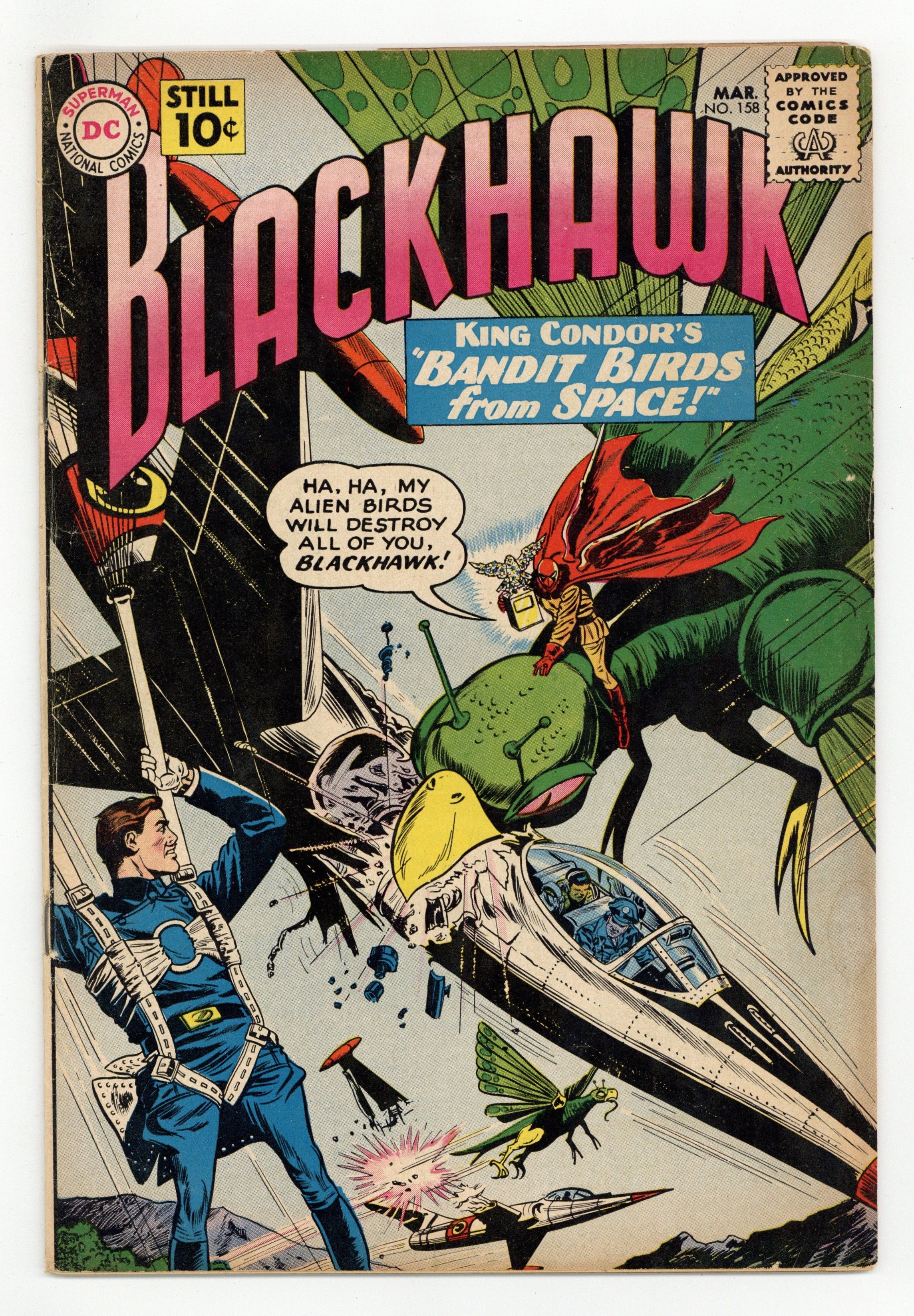 Cover by Dick Dillin and Sheldon Moldoff. Featuring: 7 page Blackhawk story "Bandit Birds from Space" (vs King Condor) drawn by Dick Dillin and Charles Cuidera; 9 page Blackhawk story "Sabotage in Blackhawk-Land" drawn by Dick Dillin and Charles Cuidera; 8 page Blackhawk story "The Peril of the Ghost Weapons" drawn by Dick Dillin and Sheldon Moldoff. Cover price $0.10.