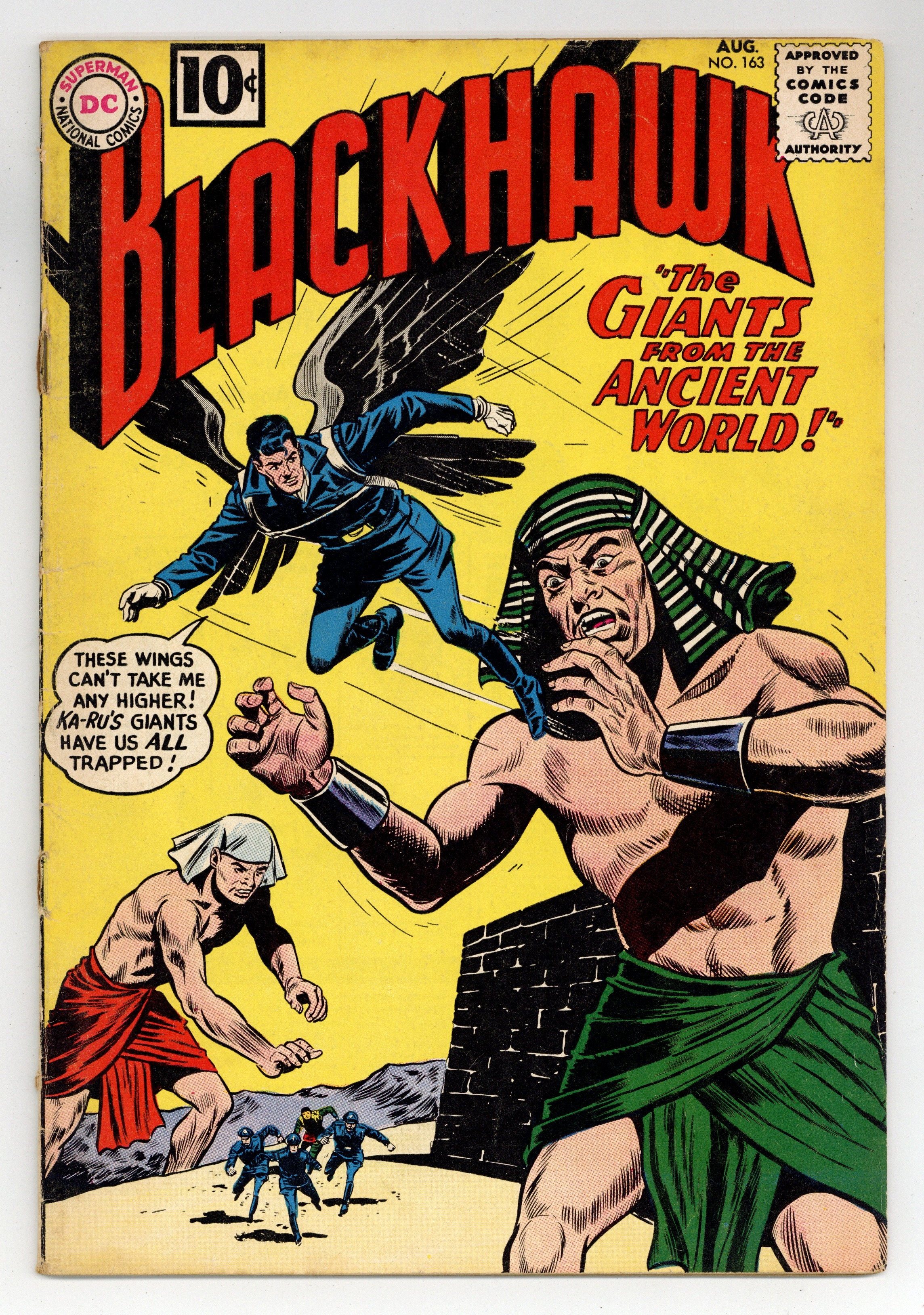 Cover by Dick Dillin & Sheldon Moldoff. Stories by Dave Wood?, Jack Miller? and unknown. Art by Dick Dillin, Charles Cuidera and Sheldon Moldoff. Three stories! "The Fisherman of Crime" - The Fisherman captures Blackhawk and uses him as a lure in his other fishing related crimes. Plus: "Lady Blackhawk's Deadly Romance" - The Blackhawks suspect Count Frederik, the favorite citizen of Moravia, is really a master thief. And: "The Giants from the Ancient World" - While fleeing the Blackhawks, Mysto discovered the ancient weapons of Ka-Run, including two giant statues that come to life to attack the Blackhawks. Also: 1-page text story "Attack by Night"! 32 pages, full color. Cover price $0.10.