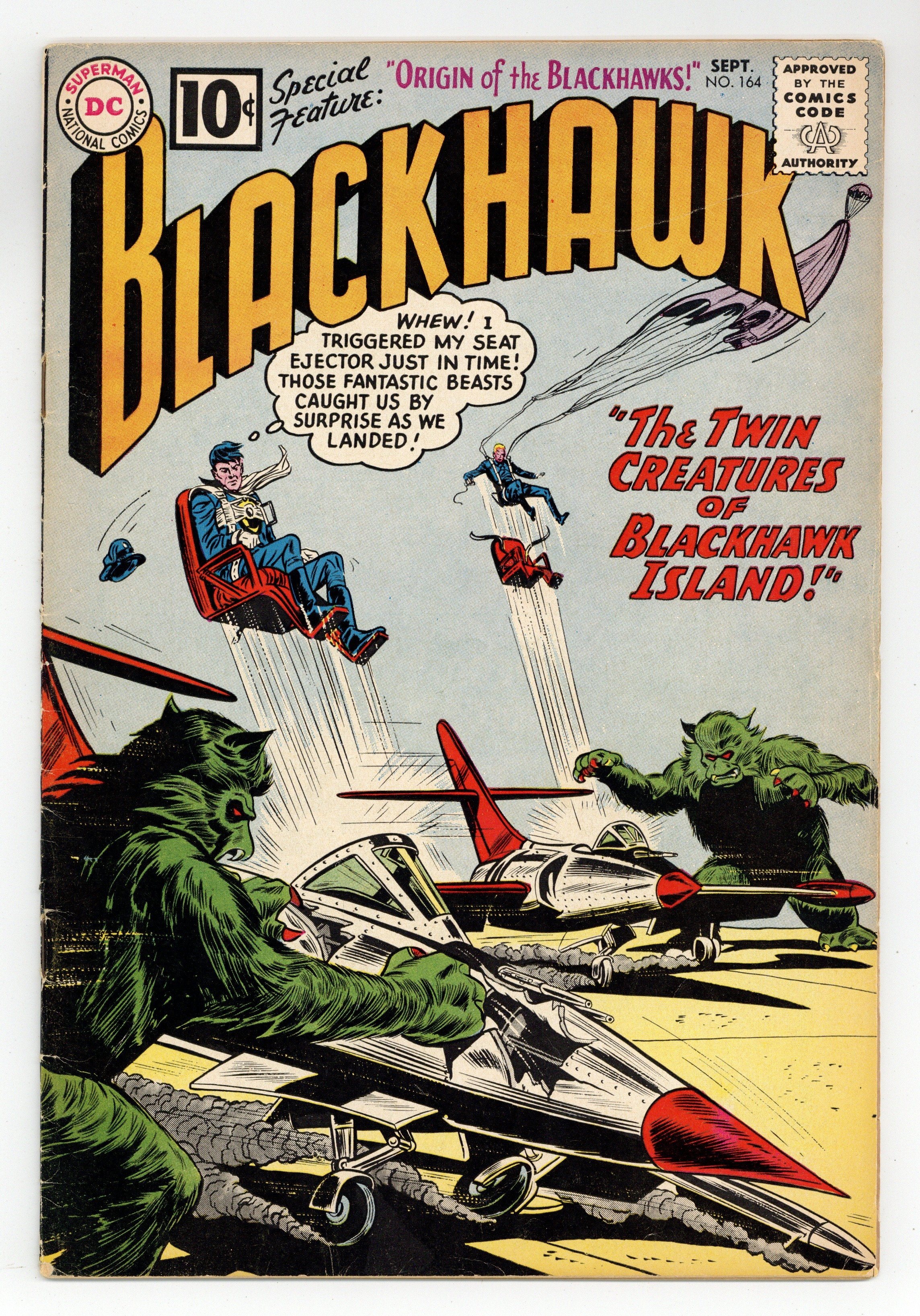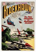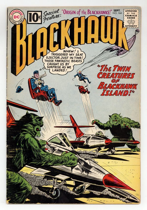 Cover by Dick Dillin & Sheldon Moldoff. Stories by Dave Wood?, Jack Miller? and unknown. Art by Dick Dillin, Charles Cuidera and Sheldon Moldoff. Three stories! "The Twin Creatures of Blackhawk Island" - Fantastic beasts catch the Blackhawks by surprise! Also featuring: "The Blackhawk Baby Sitters" and "The Deadly Distortion Ray"! Plus: 1-page text article "Origin of the Blackhawks" - Origin re-told in text with small head illustrations of the Blackhawks by Dillin & Cuidera. 32 pages, full color. Cover price $0.10.