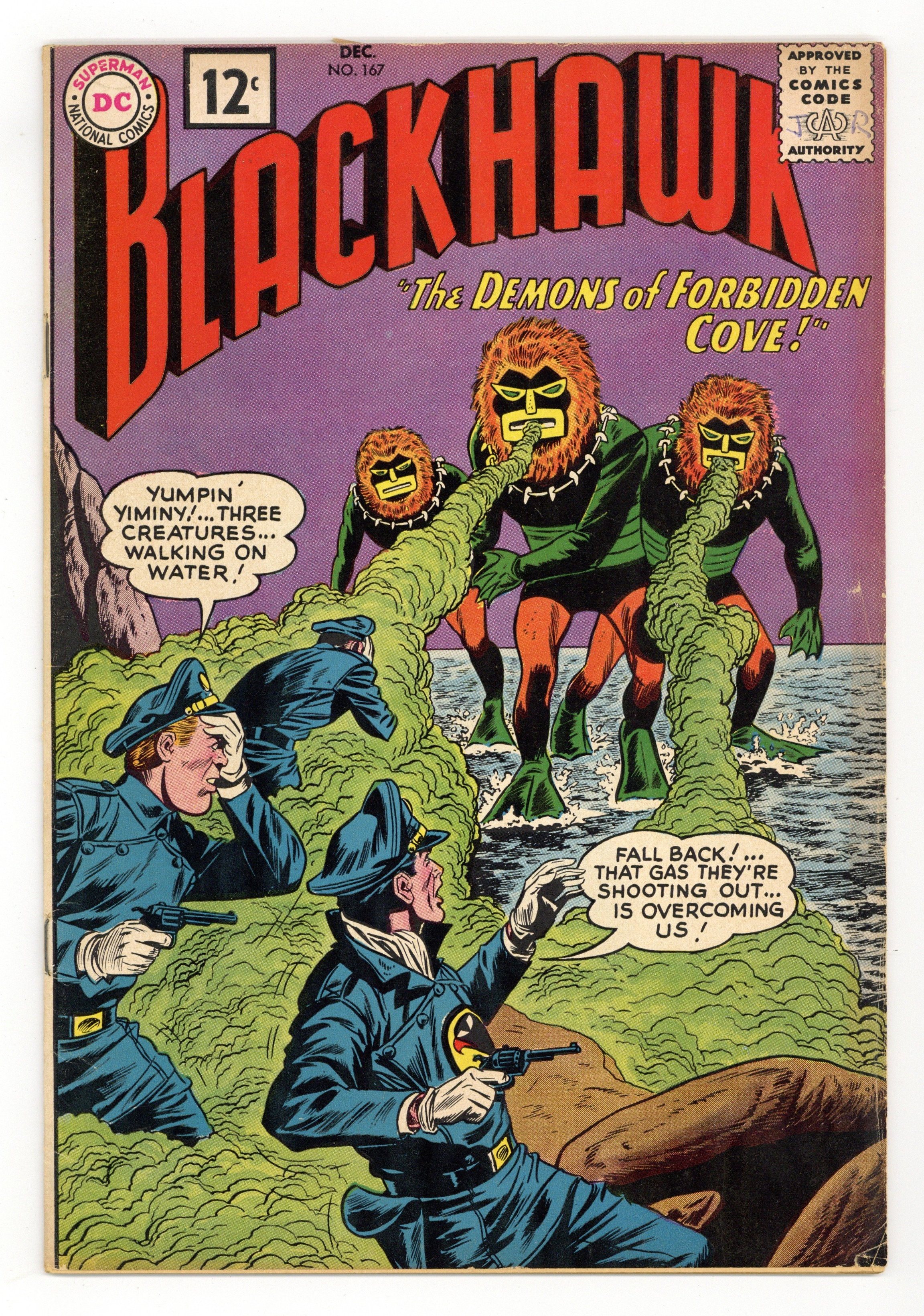 First 12c cover priced issue. Cover by Dick Dillin & Sheldon Moldoff. Stories by Dave Wood, Bob Haney and Jack Miller. Art by Dick Dillin & Charles Cuidera. Three stories! "The Demons of Forbidden Cove" - The gas that three creatures walking on water are shooting out overcomes the Blackhawks! Also featuring: "Challenge of the Solar Master" and "The Blackhawk Bandits"! Plus: 1-page text story "Mystery of the Missing Men"! 32 pages, full color. Cover price $0.12.