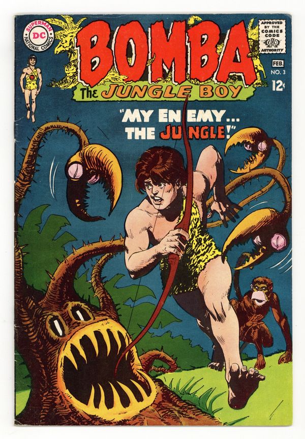 Cover art by Jack Sparling. House ad for Aquaman #37 and Tomahawk #114, art by Nick Cardy. My Enemy...the Jungle! [Part 1], script by George Kashdan, art by Jack Sparling; Chief Atachi sends his daughter Tina to enlist Bomba's help against Viracocha, who claims to be an ancient god who can control plants. My Enemy...the Jungle! Part 2. My Enemy...the Jungle! Part 3. House ad for Batman #198, pencils by Carmine Infantino and Bob Kane, inks by Murphy Anderson and Charles Paris. House ad for Superman's Girl Friend, Lois Lane #80, pencils by Curt Swan, inks by Neal Adams. 32 pgs. $0.12. Cover price $0.12.