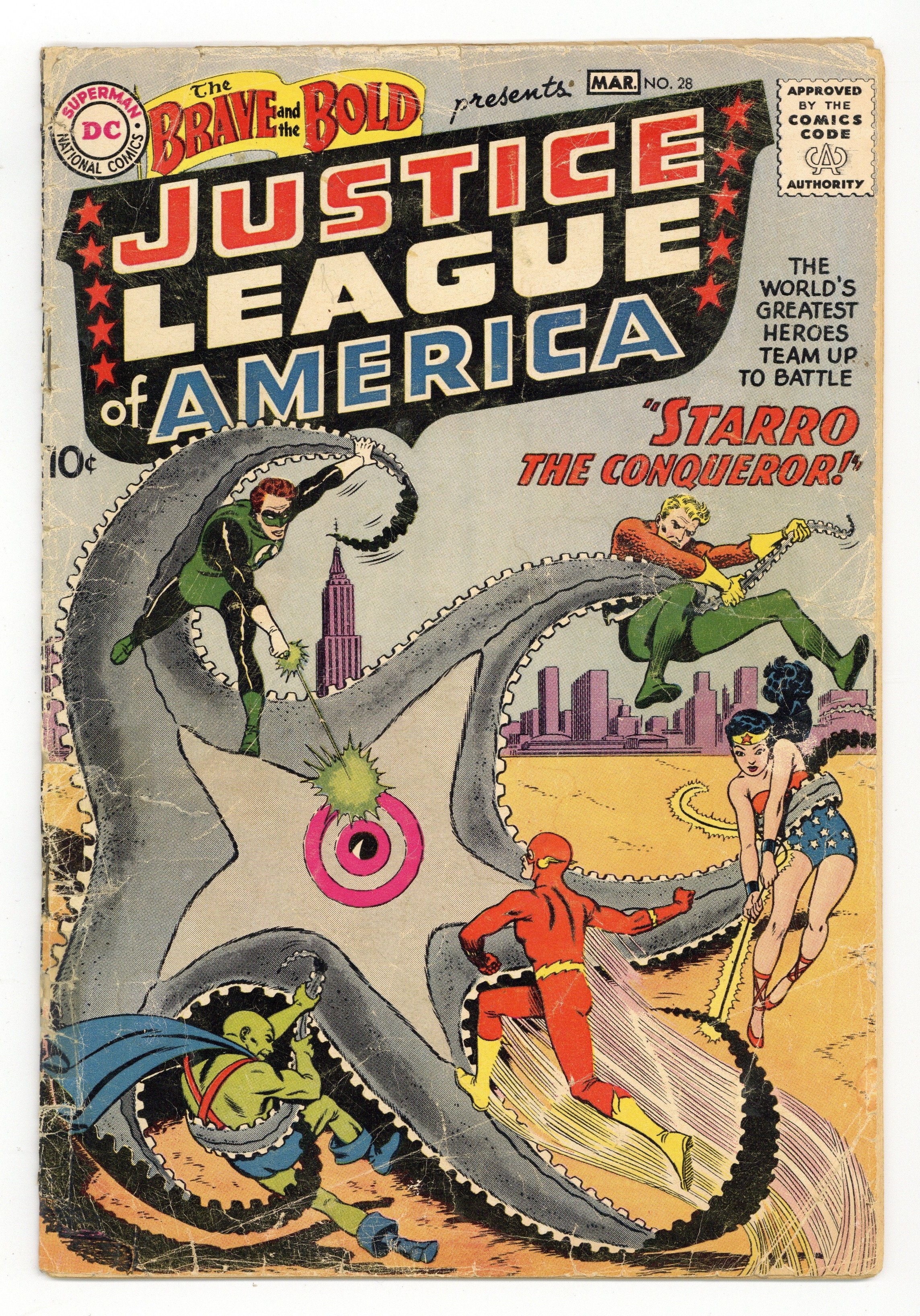 Cover by pencils Mike Sekowsky, inks by Murphy Anderson. First appearance of Justice League of America, Starro, and Snapper Carr in "Starro the Conqueror!", script by Gardner Fox, pencils by Mike Sekowsky, inks by Bernard Sachs, Joe Giella, and Murphy Anderson; Peter the Puffer Fish alerts Aquaman to an attack on Earth from an alien starfish named Starro the Conqueror; Starro has altered three ordinary starfish into his lieutenants; Aquaman alerts his friends Wonder Woman, Superman, Green Lantern, Batman, Flash, and J'onn J'onzz; Though Superman and Batman are too busy to attend, the rest meet and split up into teams. It's Fun to Help Others! public service announcement with Superboy by Jack Schiff, art by Curt Swan and Stan Kaye. Starro vs. Green Lantern, script by Gardner Fox, pencils by Mike Sekowsky, inks by Joe Giella; One of Starro's lieutenants steals and explodes an atomic bomb to absorb its power. Starro vs. Wonder Woman and John Jones, script by Gardner Fox, pencils by Mike Sekowsky, inks by Bernard Sachs. Starro vs. the Flash!, script by Gardner Fox, pencils by Mike Sekowsky, inks by Murphy Anderson. Starro vs. Justice League of America, script by Gardner Fox, pencils by Mike Sekowsky, inks by Bernard Sachs. 36 Pages, Full Color. Cover price $0.10.