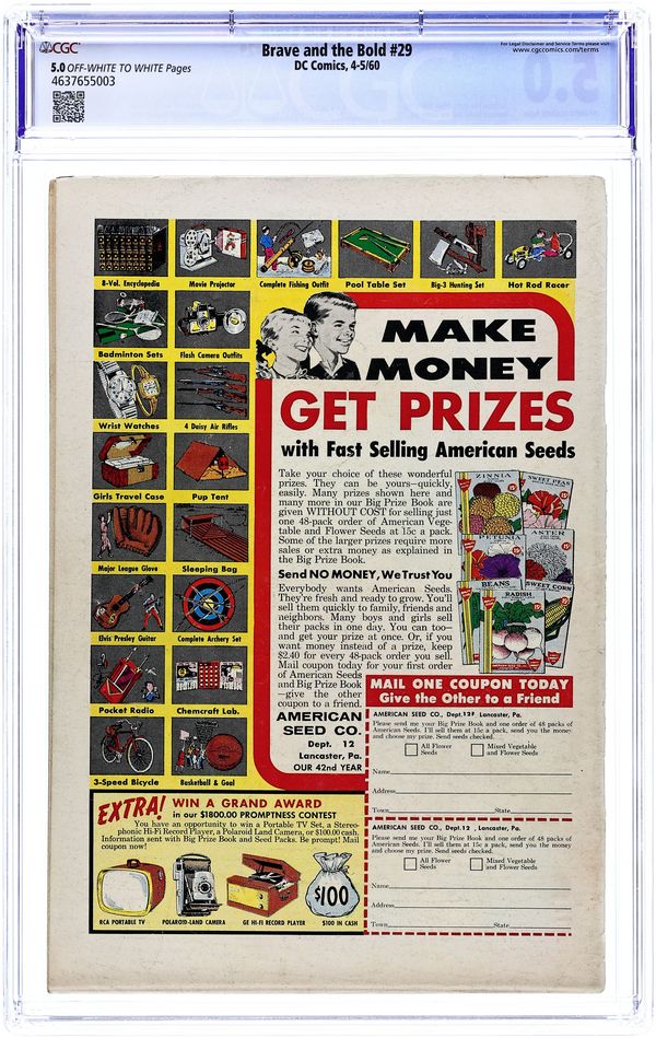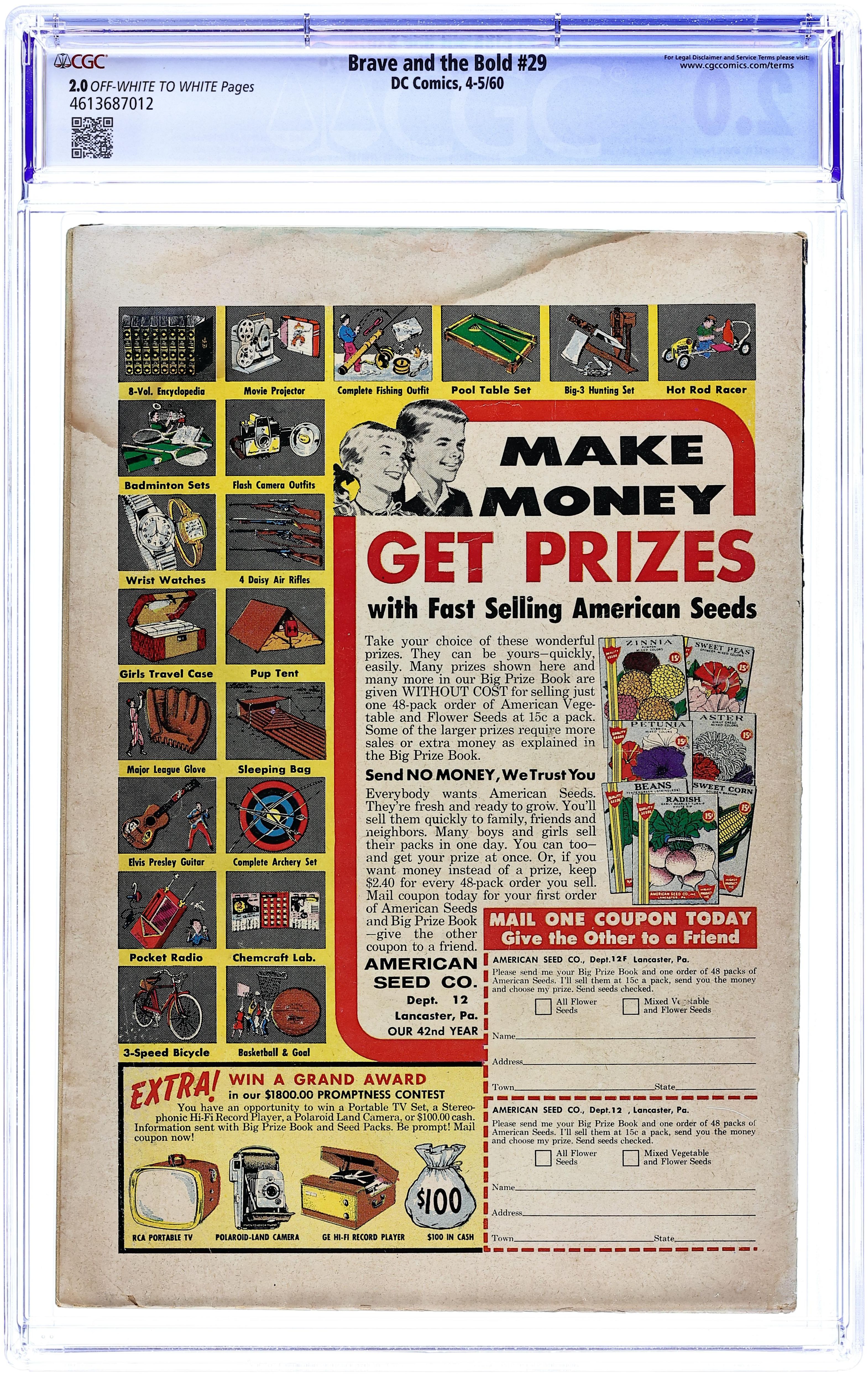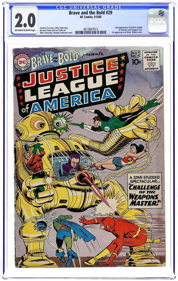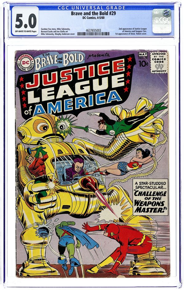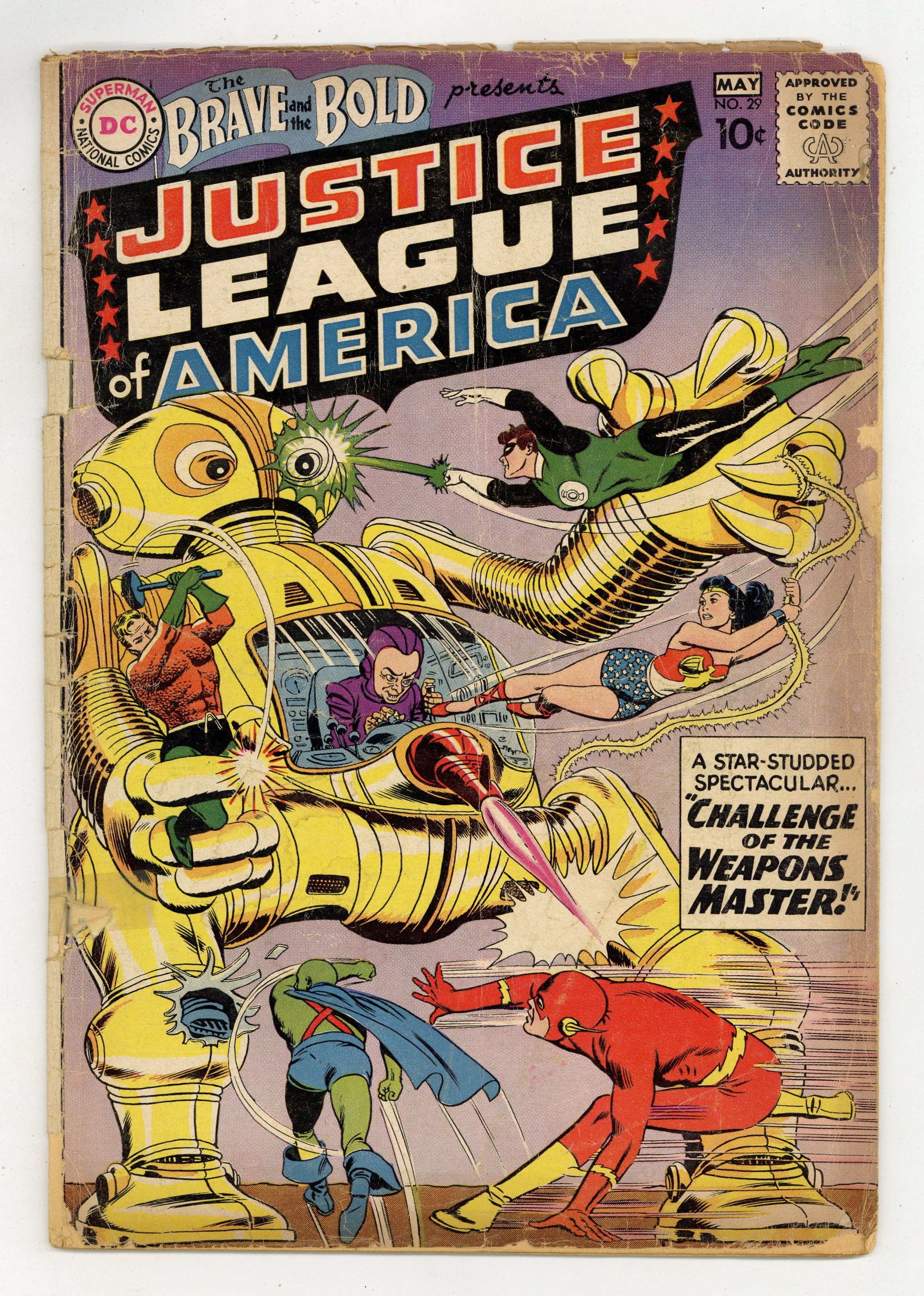 Cover by pencils Mike Sekowsky, inks by Murphy Anderson. 2nd appearance of the Justice League of America in "Challenge of the Weapons Master!" Script by Gardner Fox, pencils by Mike Sekowsky, inks by Bernard Sachs and Joe Giella; Having found an ancient book that appears to indicate that he once defeated the JLA, Xotar travels from 11,960 to the present to test four weapons against the Justice League, in order to determine which weapon will help him defeat the Intersolar Police of his own day; But the JLA counters each of Xotar's weapons and returns him to face justice in his own time. 36 Pages, Full Color. Cover price $0.10.