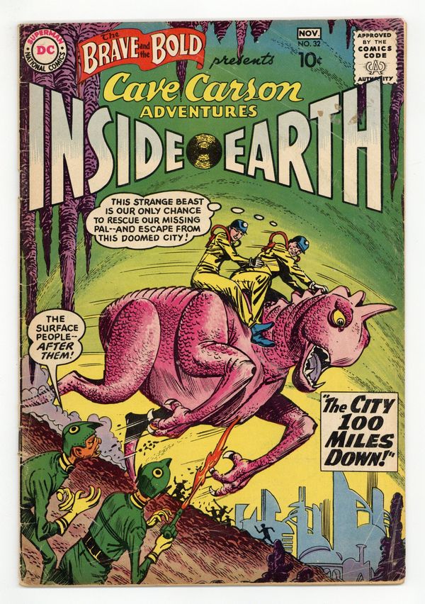 Cover by Bernard Baily. 2nd appearance of Cave Carson in "The City 100 Miles Down," script by France Herron, art by Bernard Baily; Deep, deep below the earth's surface, Cave Carson and the gang find an underworld city; They learn that it's people are dying because they breathed in noxious gas that burst through the ground below them; Most of them have already chosen to die with quiet dignity, but when the underworlder known as Xanon wants to invade the land topside in hopes to find a cure, then Cave, Bulldozer, and Christie must ally up with a rebel faction to stop him. 36 Pages, Full Color. Cover price $0.10.