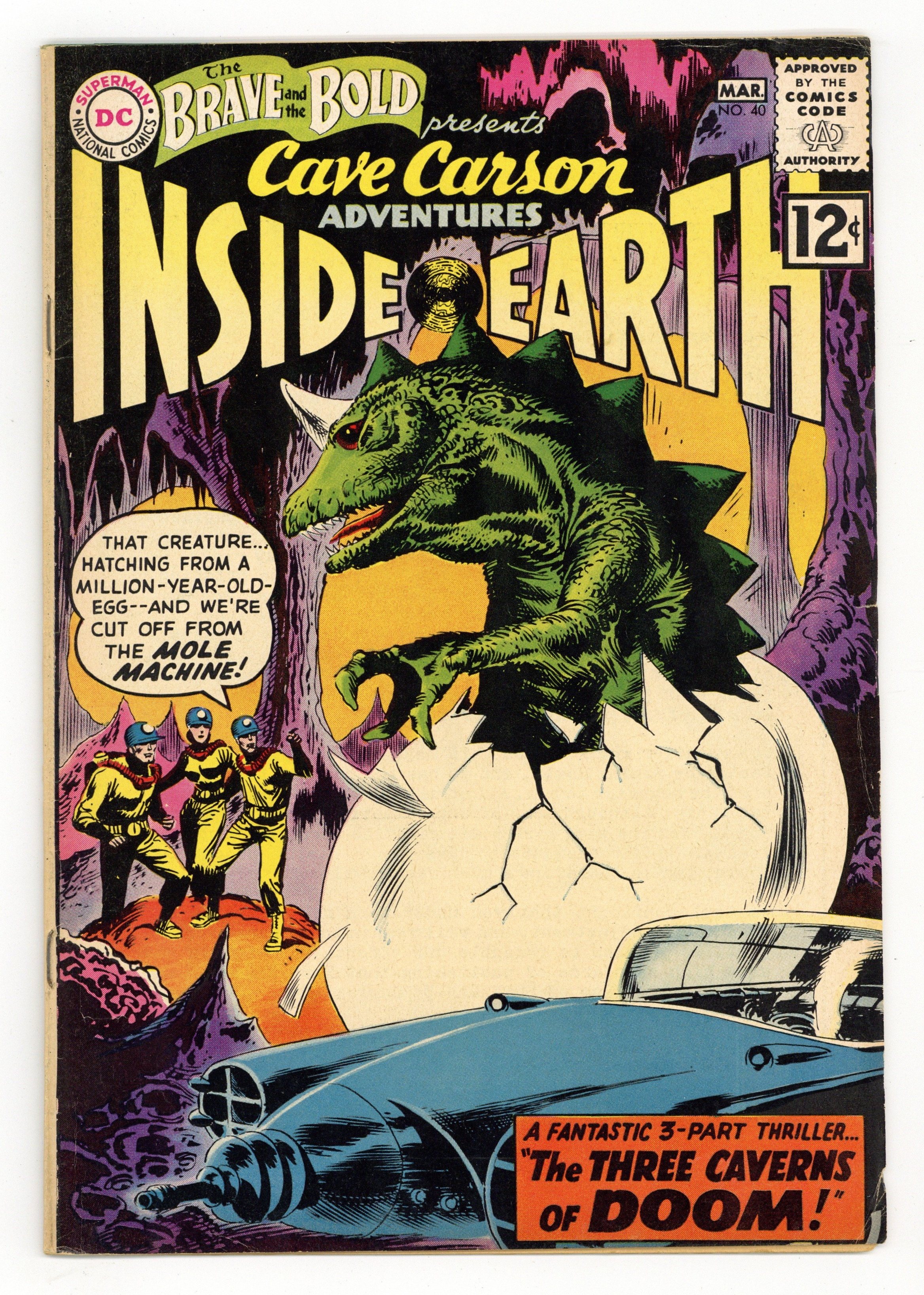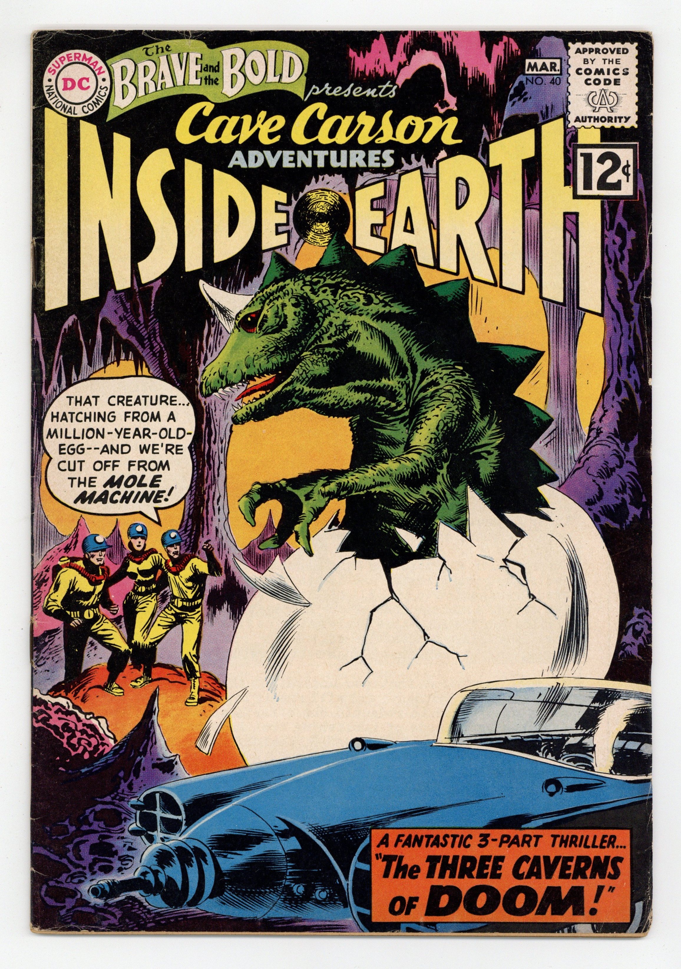 Cover by Joe Kubert. "Three Caverns of Doom," script by France Herron, art by Joe Kubert; A magic crystal, created by an ancient sorcerer, is found by a man named Zenod, who uses its power for his own evil purposes; Two more crystals remain hidden underground, and Cave Carson and his friends are going to do whatever it takes to stop Zenod from retrieving the whole set. Statement of ownership - average paid circulation 245,000. 36 Pages, Full Color. Cover price $0.12.