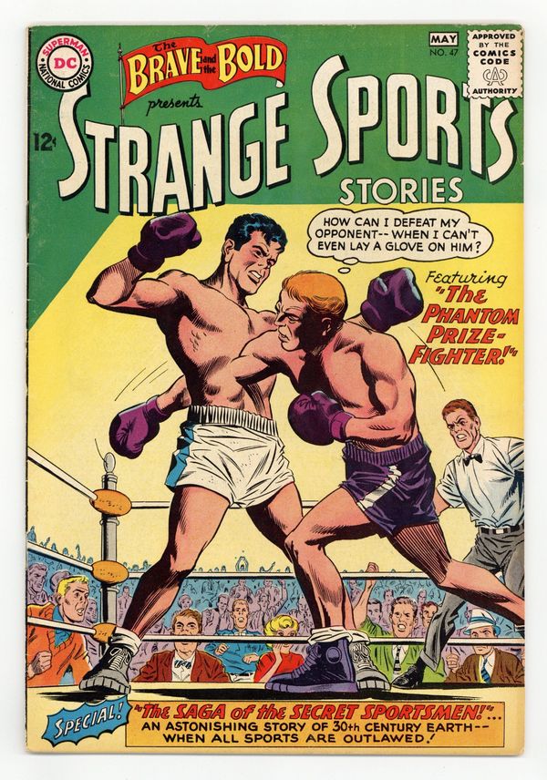 Strange Sports Stories. Cover pencils by Carmine Infantino, inks by Joe Giella. "The Phantom Prizefighter," script by Gardner Fox, pencils by Carmine Infantino, inks by Joe Giella; "Socko" was an amateur boxing champ who dreamed of becoming good enough to make it into the championship league; An alien in a crashed starship grants him his wish, but it comes with a high price. "Saga of the Secret Sportsmen," script by John Broome, pencils by Carmine Infantino, inks by Murphy Anderson; The world of the 30th Century has embraced a laid-back lifestyle, thanks largely to an invention called the Sportscaster, which lets the user play virtual sport games from the comfort of their own home; Real sports, in fact, have been outlawed all together for the danger of being too physical; Beings from Uranus have begun an invasion of Earth. 36 Pages, Full Color. Cover price $0.12.