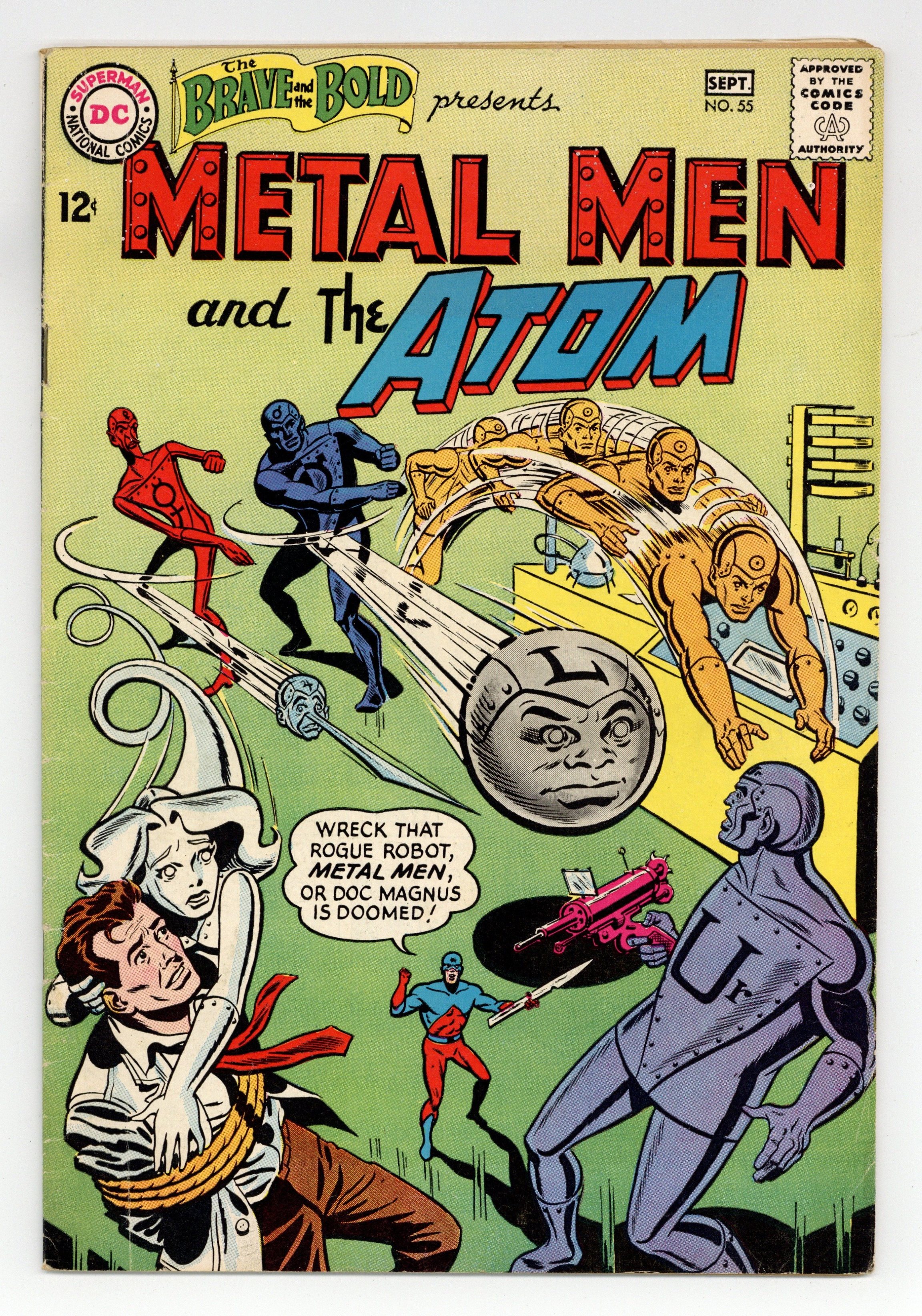 Cover pencils by Ramona Fradon, inks by Charles Paris. "Revenge of the Robot Reject," script by Bob Haney, pencils by Ramona Fradon, inks by Charles Paris; When the Metal Men are destroyed by the machinations of Dr. Will Magnus's first robot, Uranium, and his silver girlfriend Agantha, both of whom imprison him in his lab, Magnus sends an SOS to the Atom, who makes a desperate attempt to reconstruct the heroic robots. 36 Pages, Full Color. Cover price $0.12.