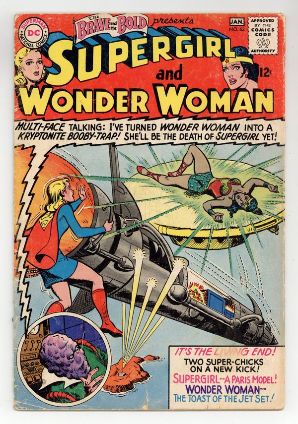 Cover by Jim Mooney. "The Revolt of the Super-Chicks," script by Bob Haney, art by John Rosenberger; When Supergirl rescues a movie actress and sees the movie crew attending to her every little need, she decides to quit being a heroine and search for romance and glamor as a Paris model; Superman makes no headway in persuading her to return to heroics, so he asks Wonder Woman to plead in his behalf; But, when Wonder Woman tracks Supergirl down at a fashion show, she finds the Girl of Steel with a new lover, Henri, and is soon romanced herself by Andre, Count de Tour; Both super-heroines are on vacation at the Isle of Love with their new swains; Unfortunately, the Isle is also the home base of Multi-Face, a super-villain who can change his facial features at will. Multi-Face attempts to destroy both heroines to save his operation. Cap's Hobby Center by Henry Boltinoff. 36 Pages, Full Color. Cover price $0.12.