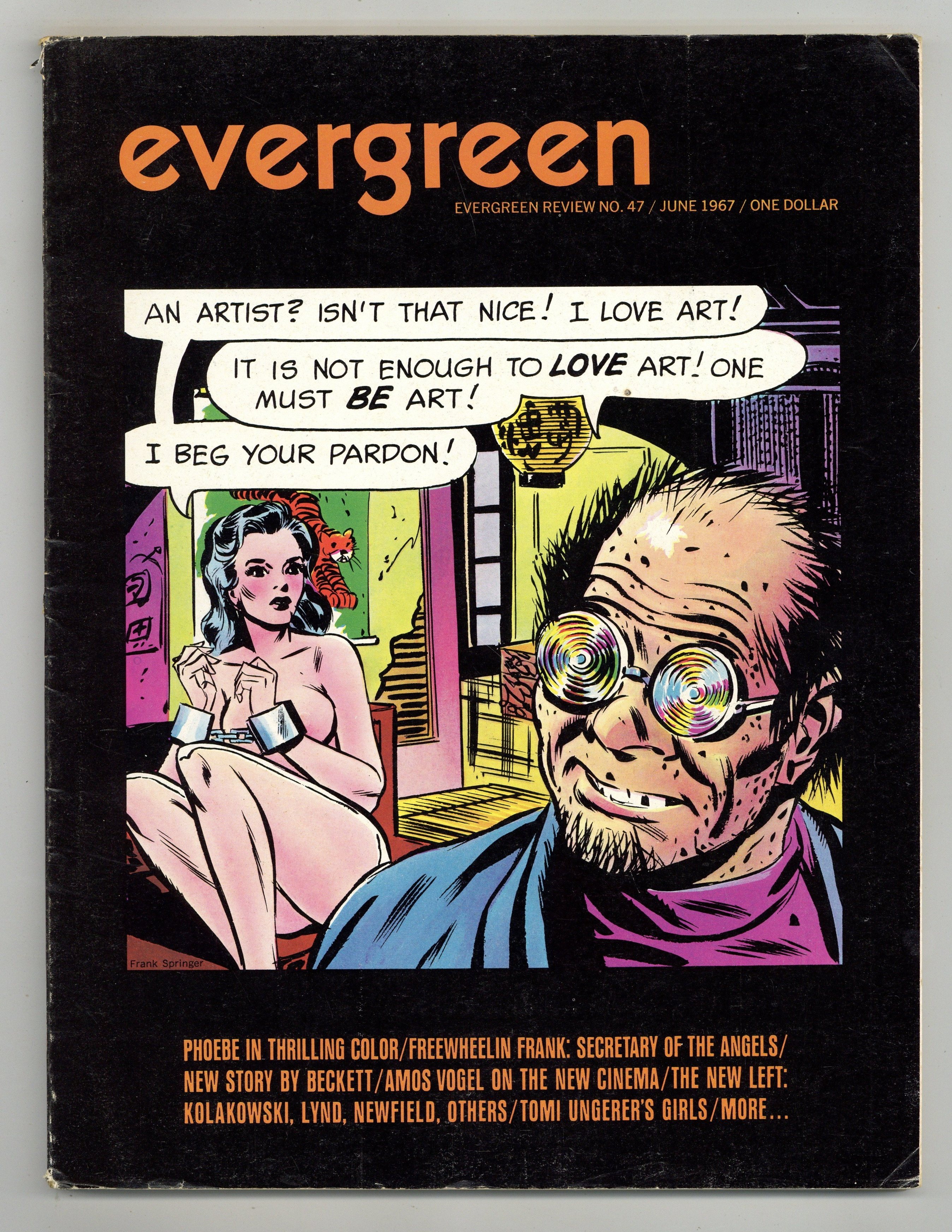 $6.00Issue 47 - June, 1967. Cover photo by Frank Springer. Men's interest magazine focused on the counter-culture movement, with related news, articles, satire comics, and nude pictorials. This issue includes articles on Paul Theroux and Samuel Becket. 8" x 10.5", 80 pages, B&W/Color. -MATURE READERS- Cover price $1.00.