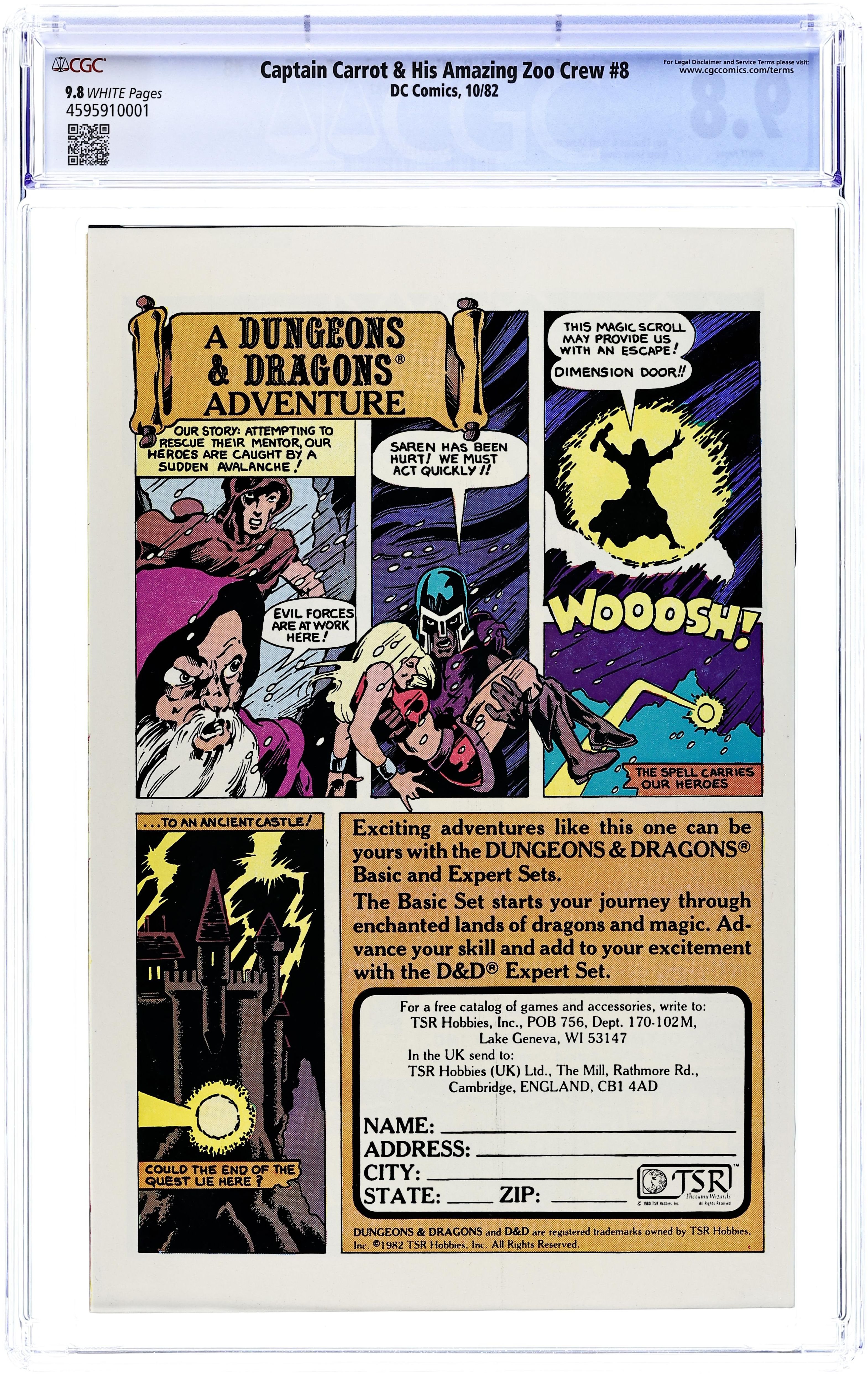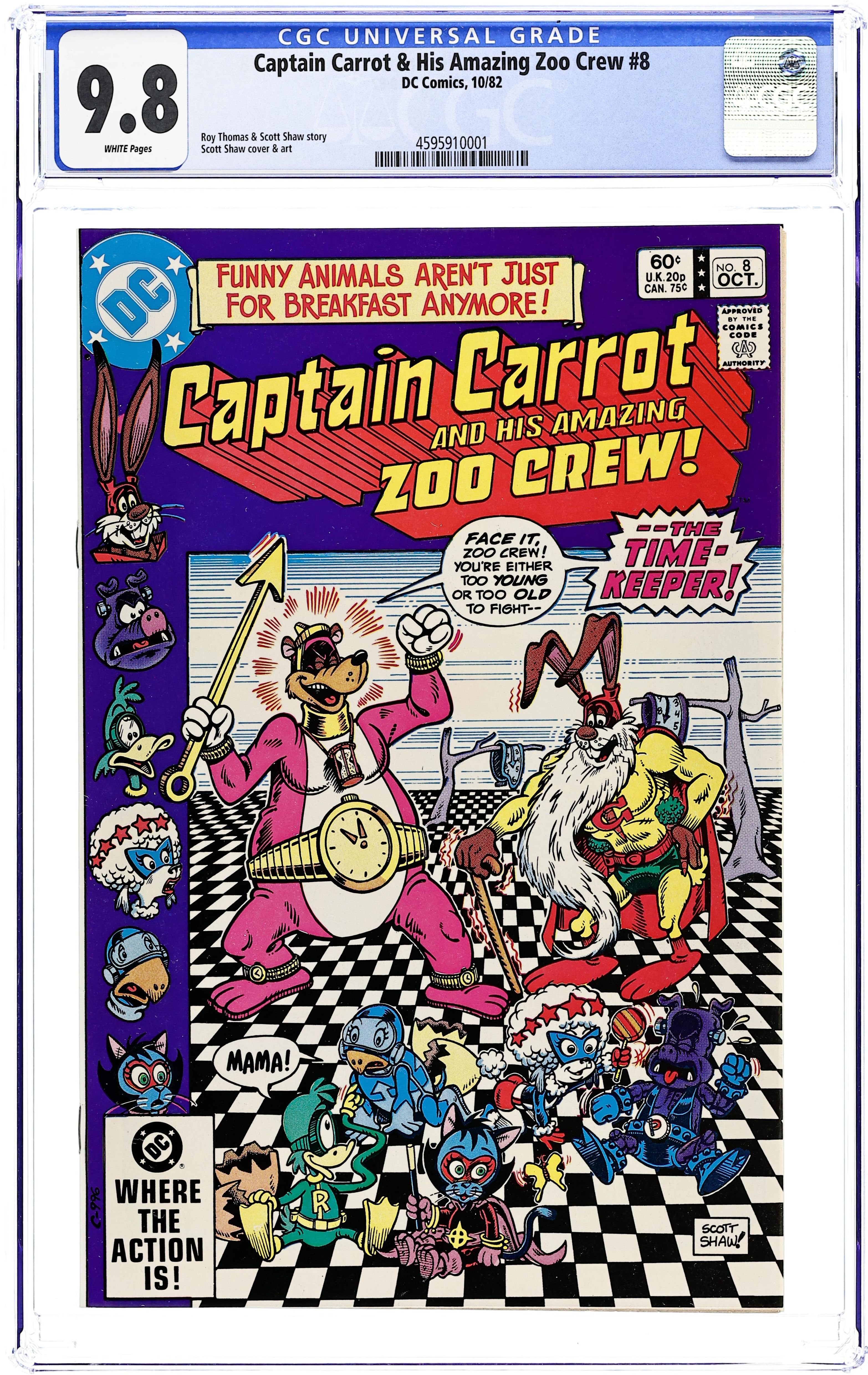 Direct Edition. Script by Roy Thomas and Scott Shaw, pencils by Scott Shaw and Mike Sekowsky, inks by Al Gordon and Scott Shaw. Cover by Scott Shaw. "Killing Time." The Zoo Crew go to outer space to try and figure out why time is no longer operating correctly. There they find a bear named The Timekeeper, who has stolen moments in time for his collection. The story introduces the Zoocruiser, the Carrotmobile, and other items. "Squawk Loudly...and Carry a Big Grudge!" Polly Wannacracker is transformed into The Squawker. Cover price $0.60.