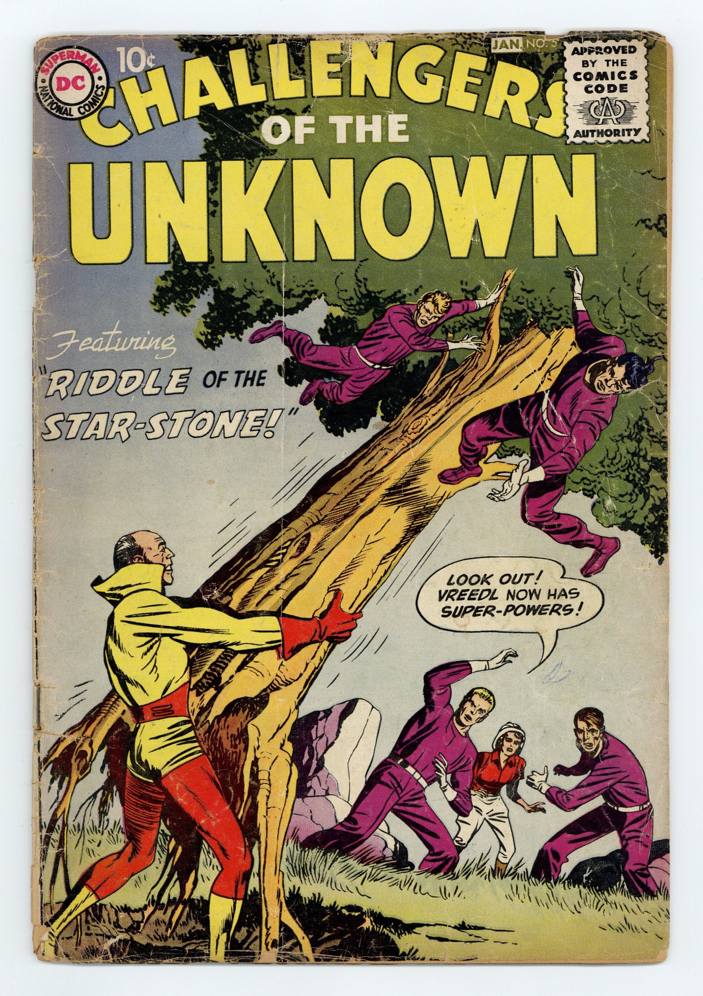 Cover art by Jack Kirby. "The Riddle of the Star-Stone" Chapter One, script and pencils by Jack Kirby, inks by Wally Wood; Professor Brandon's assistant Vreedl has stolen the Star-Stone, a device created by an ancient sorcerer, and is stealing gems to place in the stone and give himself powers; The first gem makes Vreedl into a flame man and allows him to start a stampede and delay the Challs while he secures a second gem. "Operation Blackhawks!" ad. One-page Peter Puptent Explorer story by Henry Boltinoff. "Chapter Two: The Birdman of Djiizari!", script and pencils by Jack Kirby, inks by Wally Wood; The second gem turns Vreedl into the "Birdman of Djiizari" and with that flying power he escapes the Challs. "The Singing Sorceress" text story. One-page Moolah the Mystic story by Henry Boltinoff. "Chapter Three: The Challenge of the Super Creature!", pencils by Jack Kirby, inks by Wally Wood; With another gem, Vreedl becomes a fish man and again evades the Challs; Finally, with the fourth gem, Vreedl becomes invincible until Ace points out that anyone could become like him through possession of the stone, so Vreedl destroys it, transforming himself back into an ordinary man. 36 pgs., full color. Cover price $0.10.