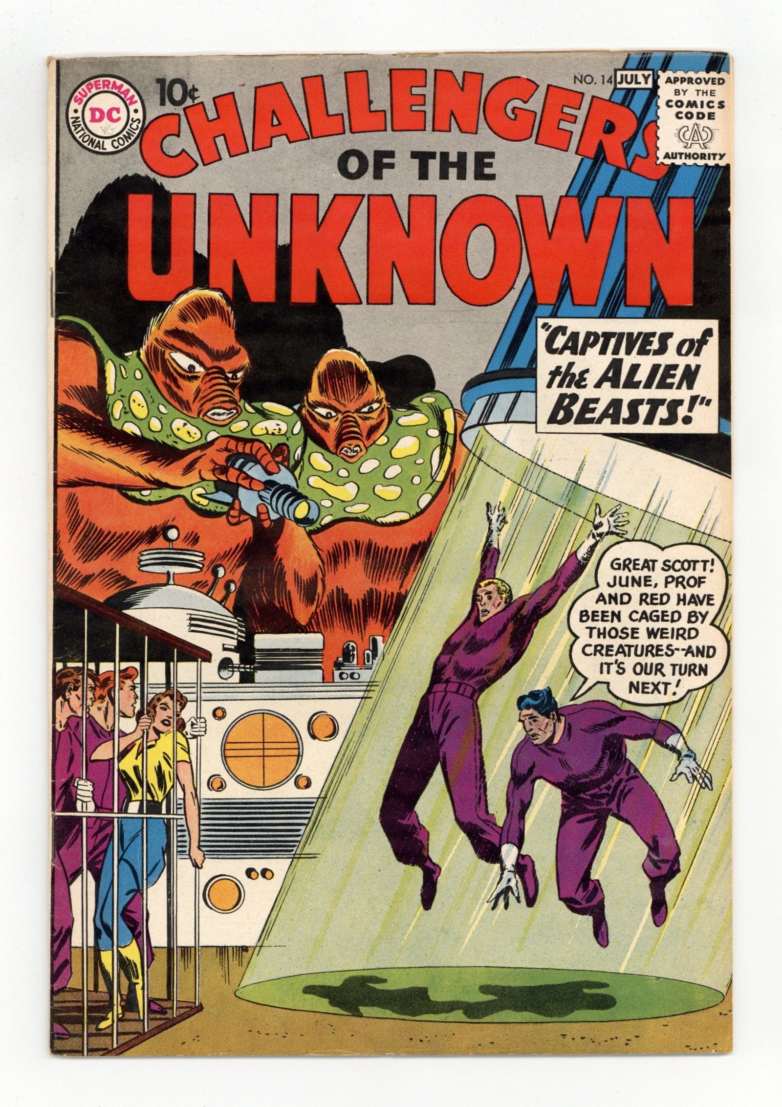 "The Man Who Conquered the Challengers." The Challengers battle the Multi-Man. Script by France Herron, art by Bob Brown. "Captives of the Alien Beasts." A giant creature teleports the Challengers and June Robbins to an alien world. Art by Brown. Cover by Brown. Cover price $0.10.