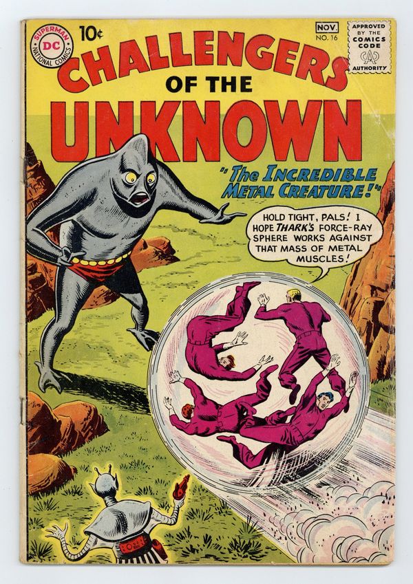 "The Incredible Metal Creature." While chasing a criminal, the Challengers come across a metal fugitive from a distant planet. "Prisoners of the Mirage World." The Challengers must rescue June Robbins from a medieval world that appears in a mirage. Art and cover by Bob Brown. Full-page ad for Justice League of America # 1. Cover price $0.10.