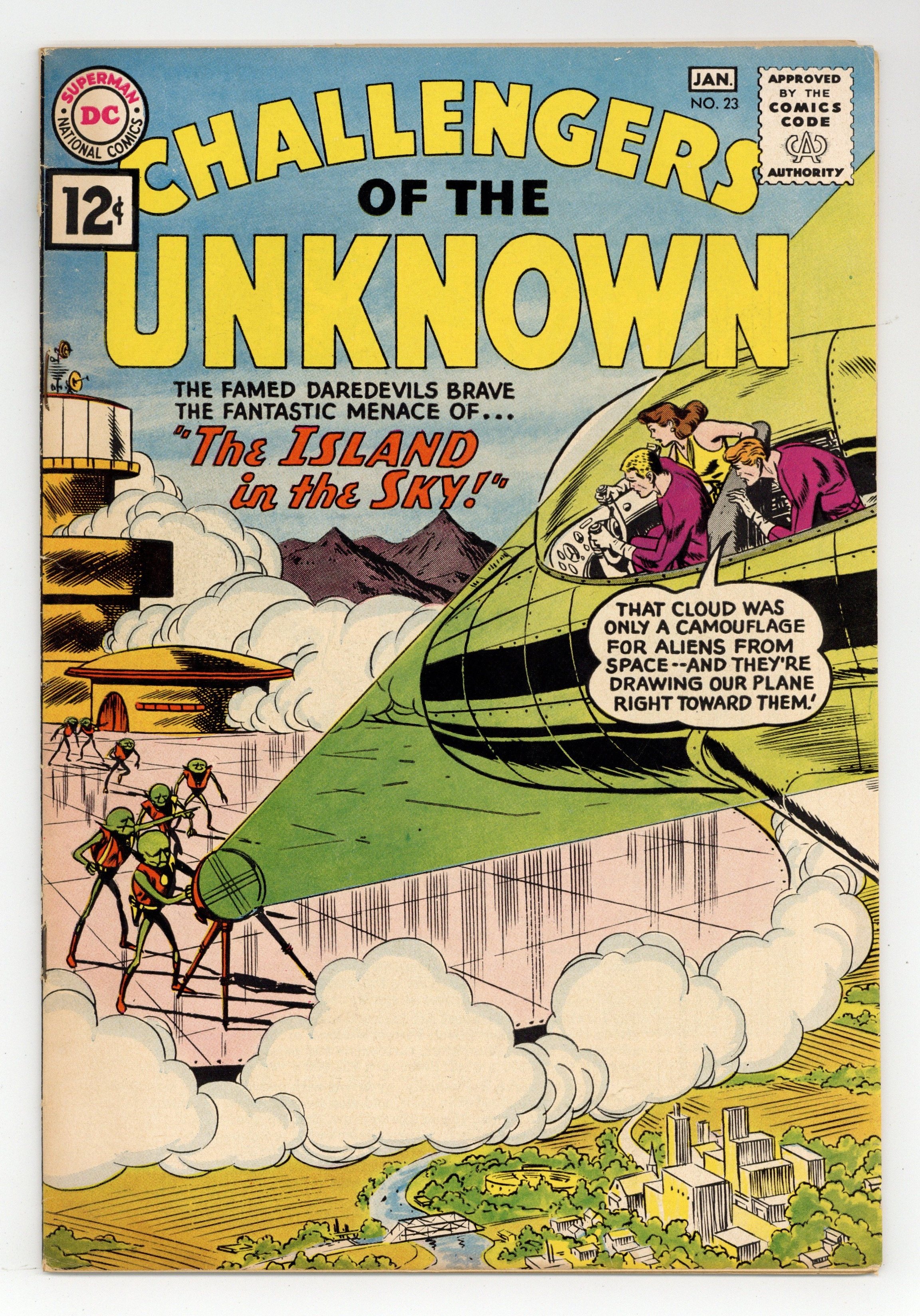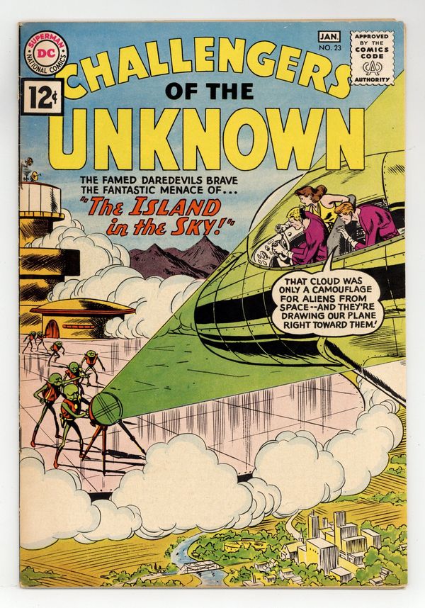 First 12-cent cover price. "Death Guarded the Doom Box." The Challengers face a series of traps and obstacles while attempting to thwart a criminal intent on landing a wizard's deadly device. "The Island in the Sky." Two alien scientists warn the Challengers about Zog, a villain who has stolen a sky platform. Art and cover by Bob Brown. Cover price $0.12.
