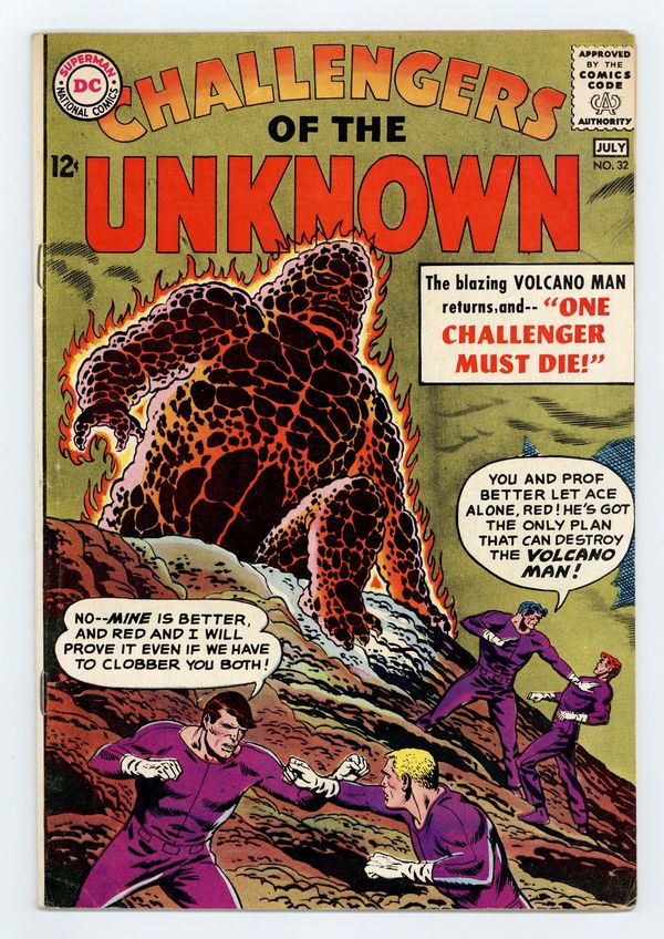 $15.75"One Challenger Must Die." The Challengers split into teams to stop the Volcano Men. Script by Arnold Drake, art by Bob Brown. "Cosmo Turns Traitor." Cosmos's master comes to Earth looking for his pet. He's convinced by an alien that the Challengers are bad guys. Art by Bob Brown. Cover by Bob Brown. Cover price $0.12.