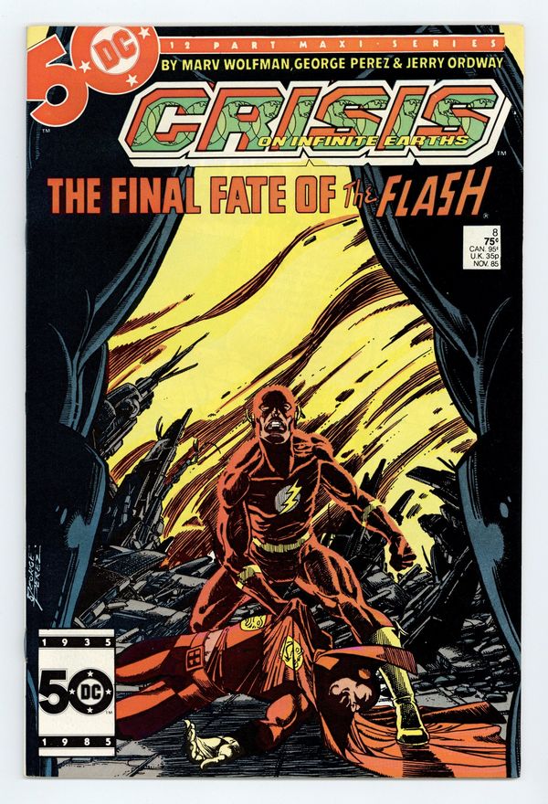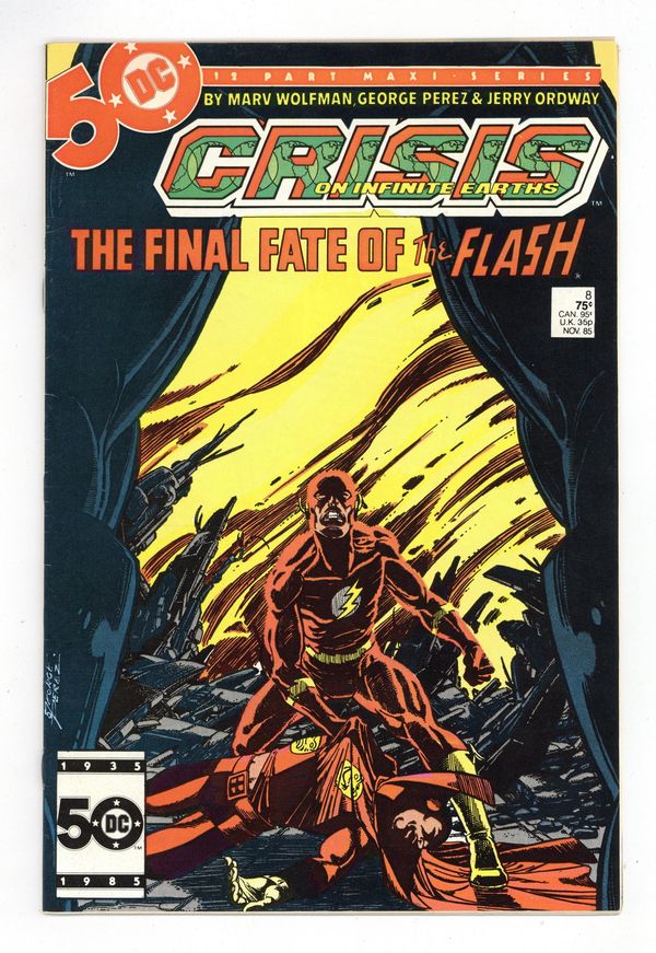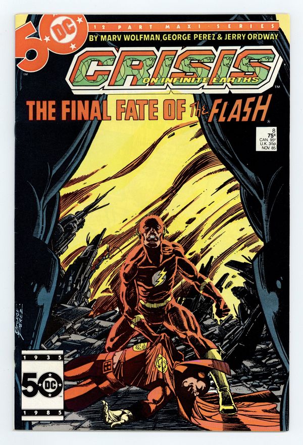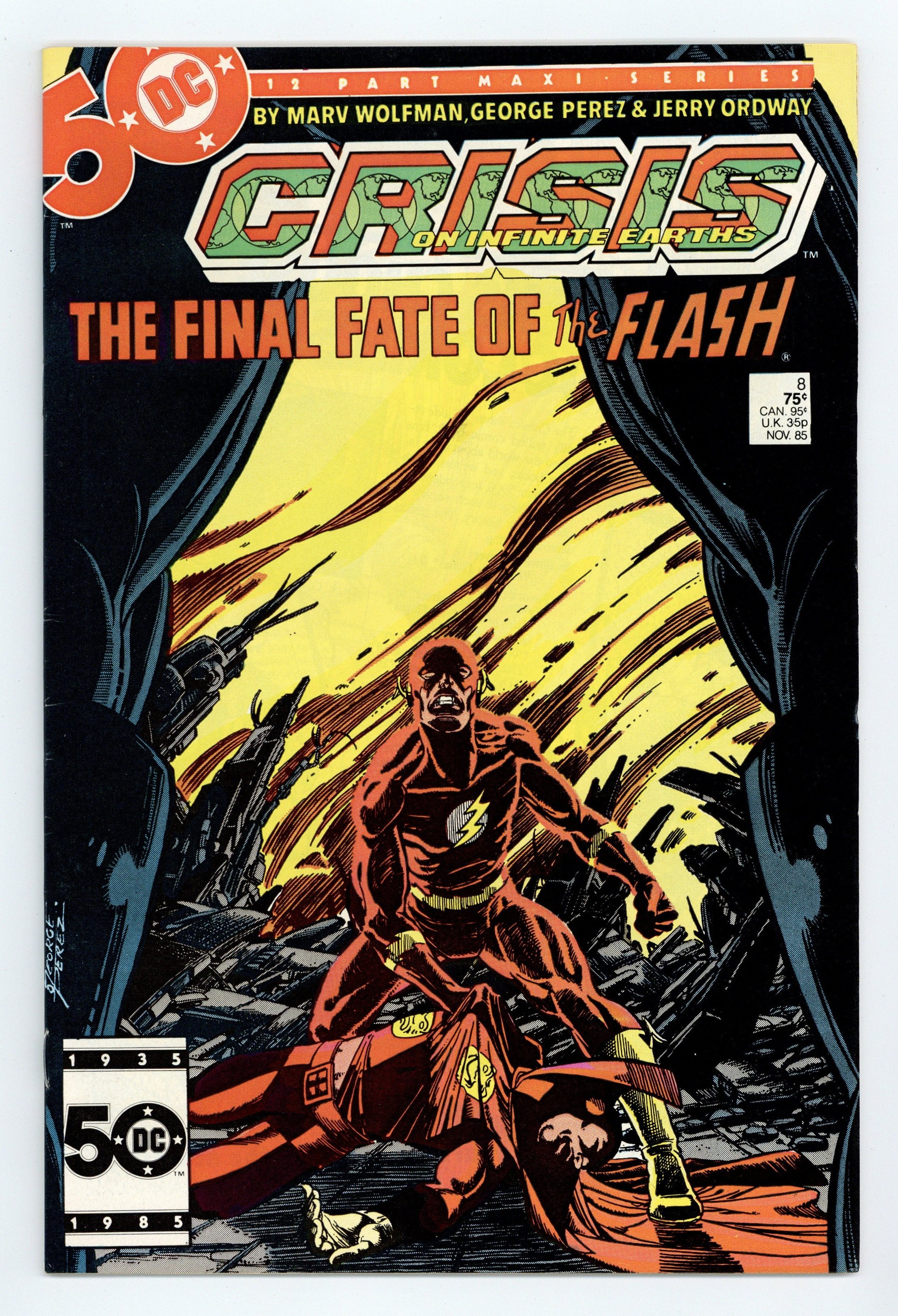 $8.80Direct Edition. "A Flash of the Lightning!" Written by Marv Wolfman. Art by George Perez and Jerry Ordway. Fresh off his set-back of last issue, the nefarious Anti-Monitor is reborn and he's more powerful and more determined than ever to destroy all life in the multiverse. As this sinister villain threatens to destroy all life in the positive universe, the only one left to stop him is the Flash, but at what cost. Don't miss one of the most heroic moments in the history of this medium as the Scarlet Speedster sacrifices all to preserve life in the DCU. Featuring the heroic death of the Flash (Barry Allen). NOTE: This was a character defining moment that can still be felt in the Post-Crisis DCU today. - Odinson, Lone Star Comics Archivist Cover price $0.75.