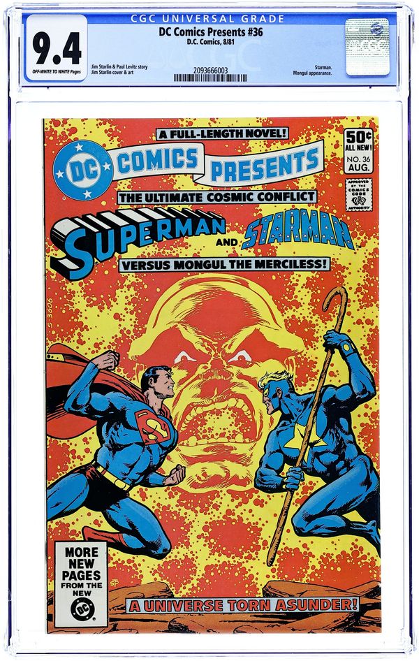 Direct Edition. Whatever Happened to Starman? - Written by Jim Starlin (co-plot) and Paul Levitz (co-plot and script). Art and Cover by Jim Starlin. A full-length novel! Superman and Starman team up to battle Mongul and rescue Starman's beloved Merria. Characters in this issue: Superman; Starman [Prince Gavyn]; Mongul (villain); Lady Merria; Jediah Rikane; Mn'Torr; Clryssa (flashback); Lord Protector Oswin (flashback). Also: Aquaman in 1-page Hostess Twinkies ad "Pirates' Gold" with pencils by Curt Swan. 32 pages, full color. Cover price $0.50.