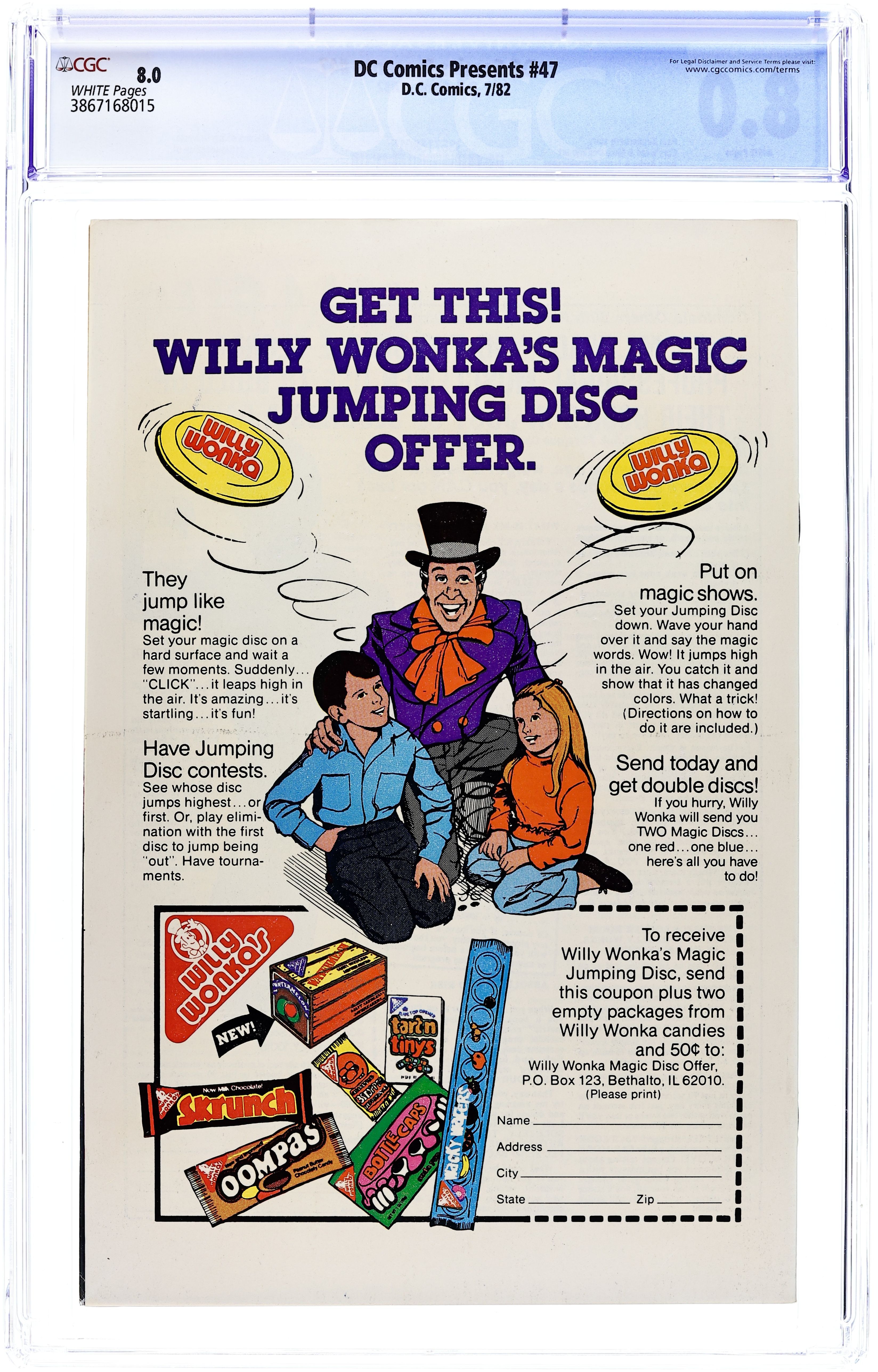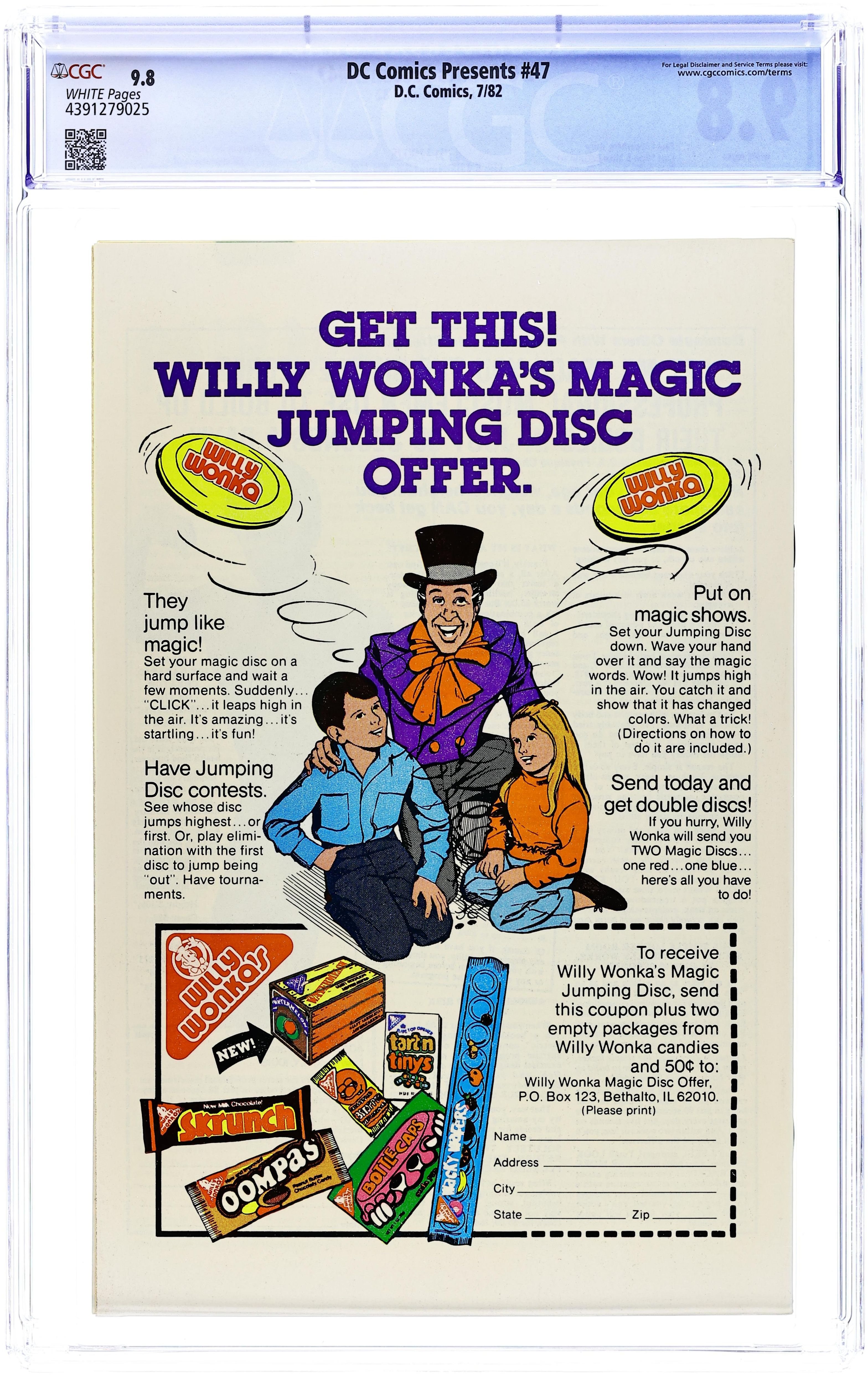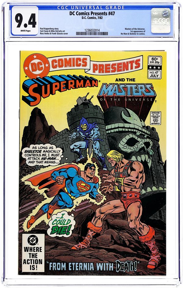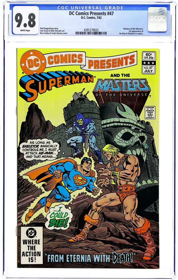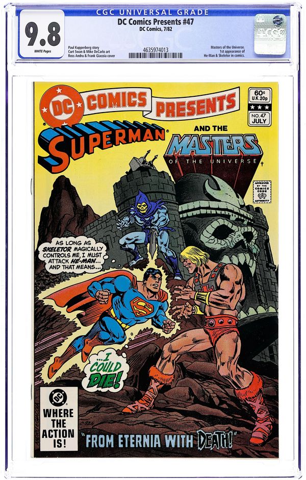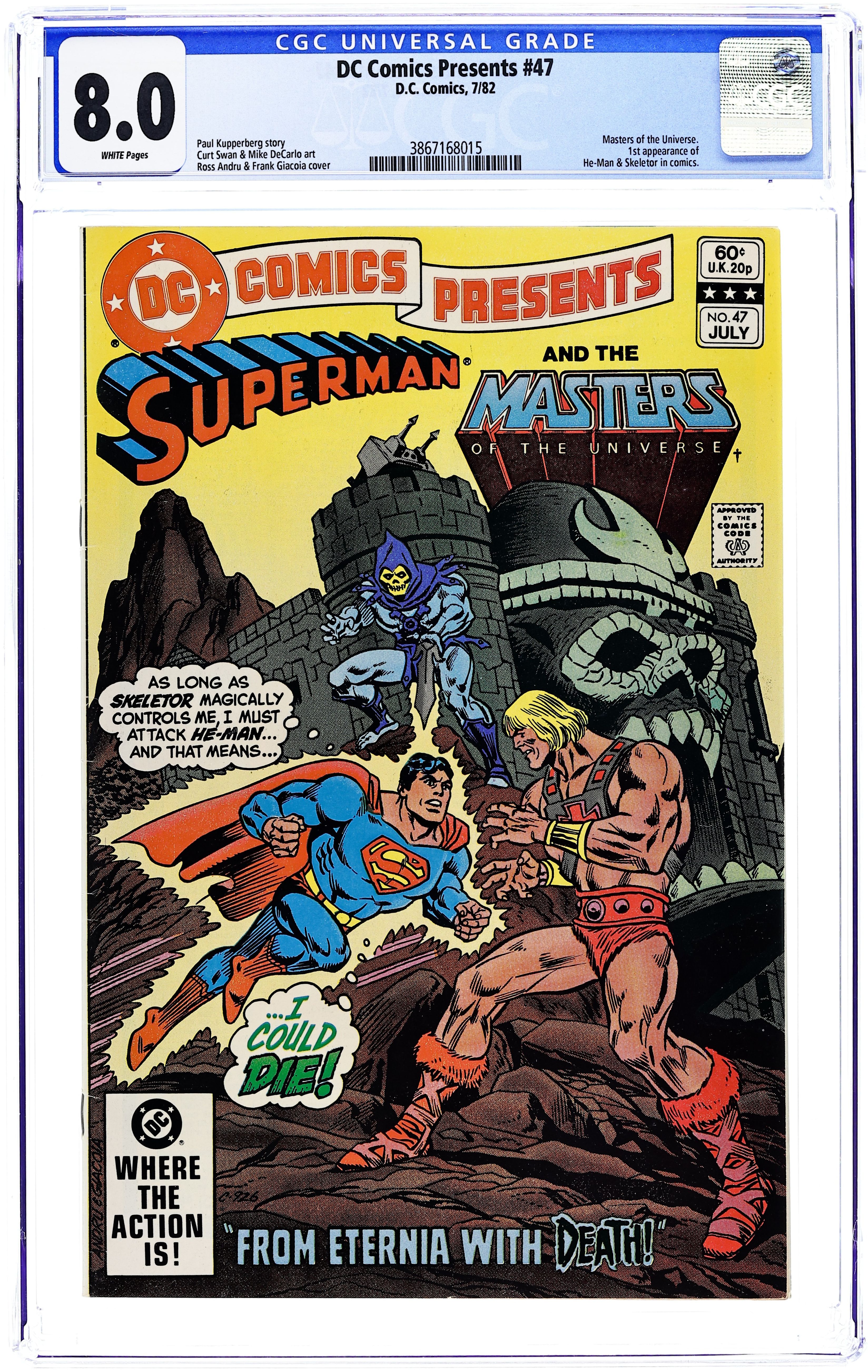 1st printing. Direct Edition. 1st appearance of He-Man and the Masters of the Universe in comics. Cover by Ross Andru and Frank Giacoia. Stories by Paul Kupperberg and Mike W. Barr. Art by Curt Swan, José Delbo, Mike DeCarlo and John Calnan. Skeletor attempts to force entry to Castle Grayskull. The energy discharge causes a storm that breaches dimensions, pulling Superman from Earth to Eternia. After a brief struggle with Skeletor, Superman teams up with He-Man to stop the villain in "From Eternia -- with Death!" by Paul Kupperberg, Curt Swan and Mike DeCarlo. Characters in this story: Battle Cat [Cringer] (introduction); Beastman (villain, introduction); Josh Coyle; The Goddess [Teela] (introduction); He-Man [Prince Adam] (introduction); Man-at-Arms (introduction); Skeletor (villain, introduction); Superman [Clark Kent]; Teela (introduction); Zoar (falcon, unnamed, introduction); Crusher (single appearance). Plus: Back-up story "Whatever Happened to Sandy, the Golden Boy?" by Mike W. Barr, José Delbo and John Calnan. Characters in this story: The Sandman [Wesley Dodds] (also in flashback); Sandy the Golden Boy [Sandy Hawkins] (also in flashback); The Shatterer [Dr. Price] (villain, single appearance, death); Dr. Raymond Baxter (in flashback); Roger Phelps (security guard). 32 pages, full color. Cover price $0.60.