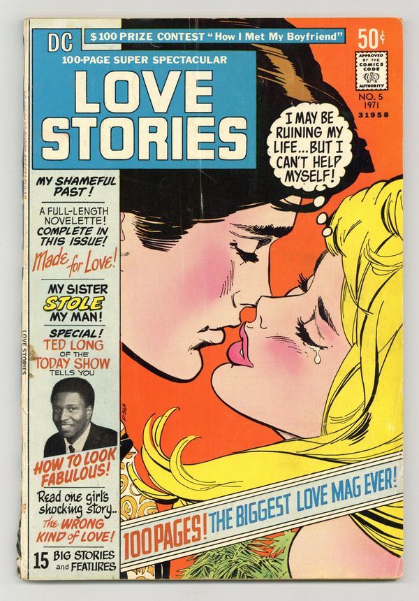 Love Stories. Featuring: 1 page "Table of Contents" drawn by Tony DeZuniga; 6 page reprint story "How Do I Know When I'm Really In Love?" written by Robert Kanigher and drawn by Win Mortimer; 14 page reprint story "My Shameful Past" written by Robert Kanigher and drawn by Jay Scott Pike, Art Saaf & Vince Colletta; 8 page reprint story "My Sister Stole My Man" written by Robert Kanigher and drawn by John Romita; 2 page text article "How I Met My Boyfriend" (ongoing contest; readers submit stories of their first meeting with their boyfriends) drawn by John Rosenberger; 7 page reprint story "The Other Girl" written by Robert Kanigher and drawn by Tony Abruzzo; 7 page reprint story "The Wrong Kind of Love" written by Robert Kanigher and drawn by Ric Estrada & Wally Wood; 2 page text article "How To Look Fabulous" (beauty tips from Ted Long, hairdresser for the NBC television program The Today Show) written by Ted Long and drawn by Morris Waldinger; 12 page reprint story "Made For Love Chapter 1" written by Jack Miller and drawn by Jay Scott Pike; 1 page text story "What's in a Name?"; 12 page reprint story "Love Is Forever (Made For Love Chapter 2)" written by Jack Miller and drawn by Jay Scott Pike & Bob Oksner; 9 page reprint story "I Didn't Want His Love" written by Robert Kanigher and drawn by Norman Nodel; 7 page reprint story "Good-Bye, Lover" written by Robert Kanigher and drawn by Mort Drucker & Bob Lander; 8 page reprint story "Happy Ending" written by Robert Kanigher and drawn by Mike Sekowsky & Bernard Sachs; 1 page filler "Where is Love?" drawn by Mort Drucker (illustrated poem, inside back cover). Cover by Bob Oksner. Back cover by Charlie Armentano. Cover price $0.50.