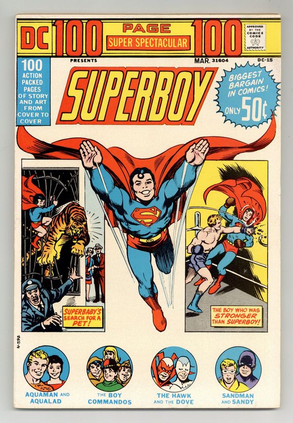 Superboy reprints and more. Featuring: 12 page Superboy reprint story "The Boy Who Was Stronger Than Superboy" written by Jerry Siegel and drawn by George Papp; 13 page Boy Commandos reprint story "Nostradamus Predicts" written by Joe Simon & Jack Kirby and drawn by Jack Kirby & Joe Simon; 8 page Superboy reprint story "The Boy of the Year Contest" written by Otto Binder and drawn by John Sikela; 7 page Aquaman reprint story "The Menace of Aqualad!" written by Robert Bernstein and drawn by Ramona Fradon; 11 page Hawk & Dove reprint story "Twice Burned" written by Steve Skeates and drawn by Gil Kane & Sal Trapani; 8 page Superboy reprint story "The Trial of Superboy" drawn by Creig Flessel; 10 page Sandman reprint story "A Drama in Dreams" written by Jack Kirby and drawn by Jack Kirby & Joe Simon; 15 page Dial H for Hero reprint story "Villain with the Doomsday Stare" written by Dave Wood and drawn by Jim Mooney; 10 page Superboy reprint story "Superbaby's Search for a Pet" written by Otto Binder and drawn by George Papp. Wraparound cover by Nick Cardy. Cover price $0.50.