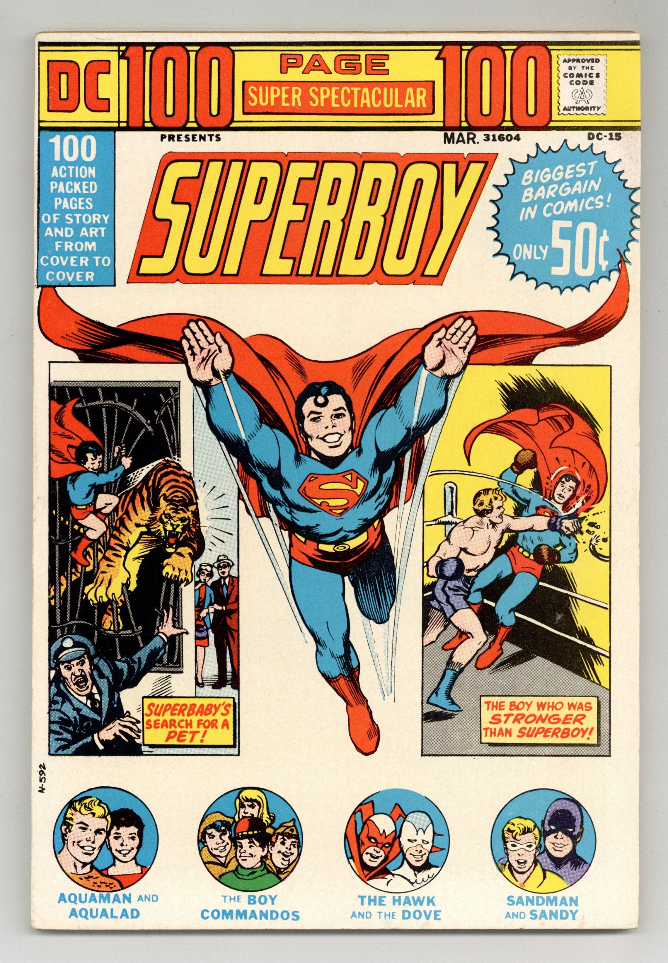 $24.00Superboy reprints and more. Featuring: 12 page Superboy reprint story "The Boy Who Was Stronger Than Superboy" written by Jerry Siegel and drawn by George Papp; 13 page Boy Commandos reprint story "Nostradamus Predicts" written by Joe Simon & Jack Kirby and drawn by Jack Kirby & Joe Simon; 8 page Superboy reprint story "The Boy of the Year Contest" written by Otto Binder and drawn by John Sikela; 7 page Aquaman reprint story "The Menace of Aqualad!" written by Robert Bernstein and drawn by Ramona Fradon; 11 page Hawk & Dove reprint story "Twice Burned" written by Steve Skeates and drawn by Gil Kane & Sal Trapani; 8 page Superboy reprint story "The Trial of Superboy" drawn by Creig Flessel; 10 page Sandman reprint story "A Drama in Dreams" written by Jack Kirby and drawn by Jack Kirby & Joe Simon; 15 page Dial H for Hero reprint story "Villain with the Doomsday Stare" written by Dave Wood and drawn by Jim Mooney; 10 page Superboy reprint story "Superbaby's Search for a Pet" written by Otto Binder and drawn by George Papp. Wraparound cover by Nick Cardy. Cover price $0.50.