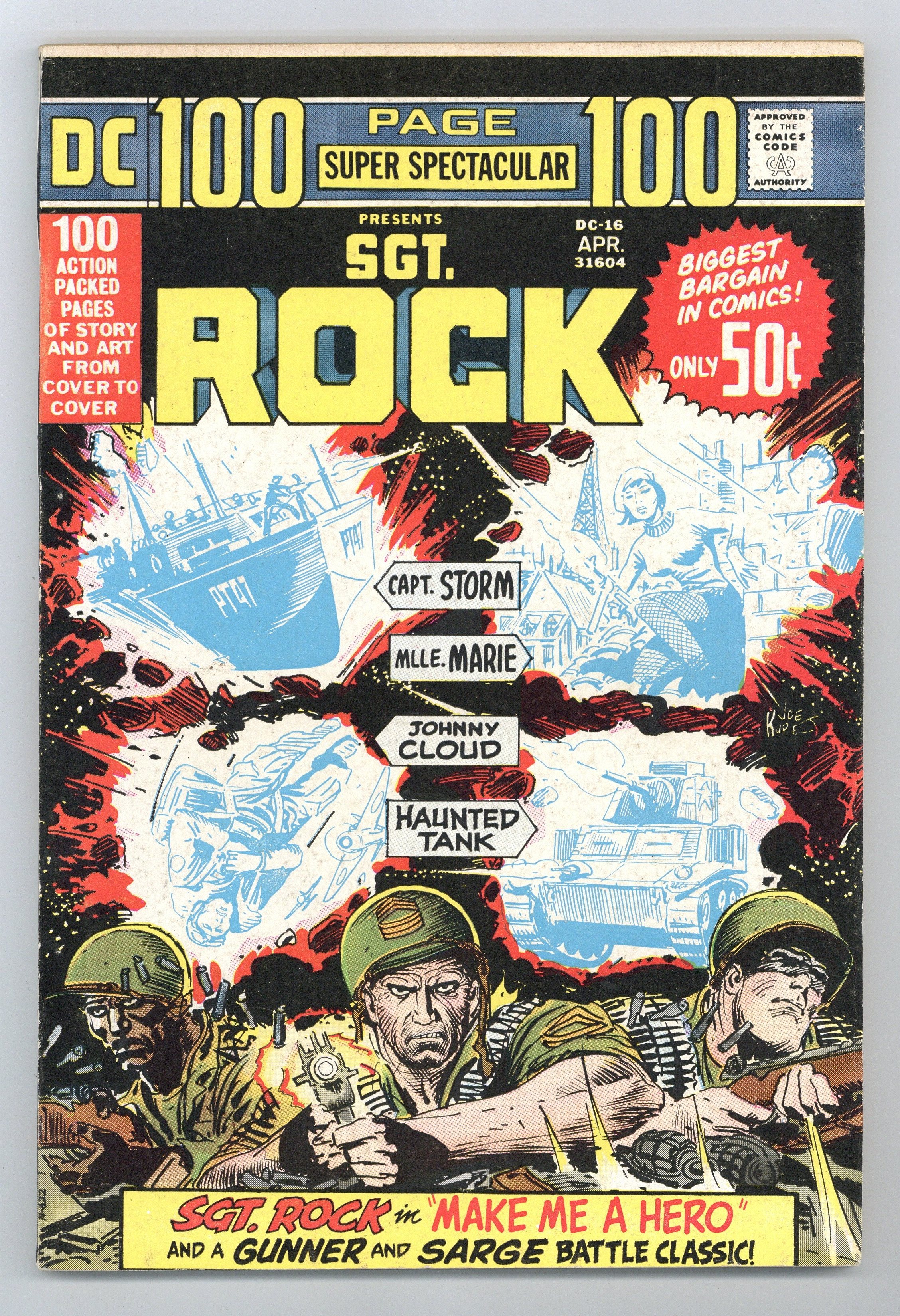 Sgt. Rock reprints. Featuring: 13 page Sgt. Rock reprint story "Make Me a Hero" written by Bob Kanigher and drawn by Joe Kubert; 24 page Captain Storm reprint story "Killer Hunt" written by Bob Kanigher and drawn by Irv Novick; 17 page Johnny Cloud reprint story "The Flying Chief" written by Bob Kanigher and drawn by Irv Novick; 12 page Mlle. Marie reprint story "Battle Doll" written by Bob Kanigher and drawn by Jerry Grandenetti; 13 page Gunner & Sarge reprint story "Gunner's Choice" written by Bob Kanigher and drawn by Jerry Grandenetti; 13 page Haunted Tank reprint story "Haunted Tank Vs. Ghost Tank" starring Haunted Tank, Jeb Stuart, Arch Asher, Rick Rawlins, Slim Stryker & General Jeb Stuart (ghost), written by Bob Kanigher and drawn by Russ Heath. Cover by Joe Kubert. Cover price $0.50.