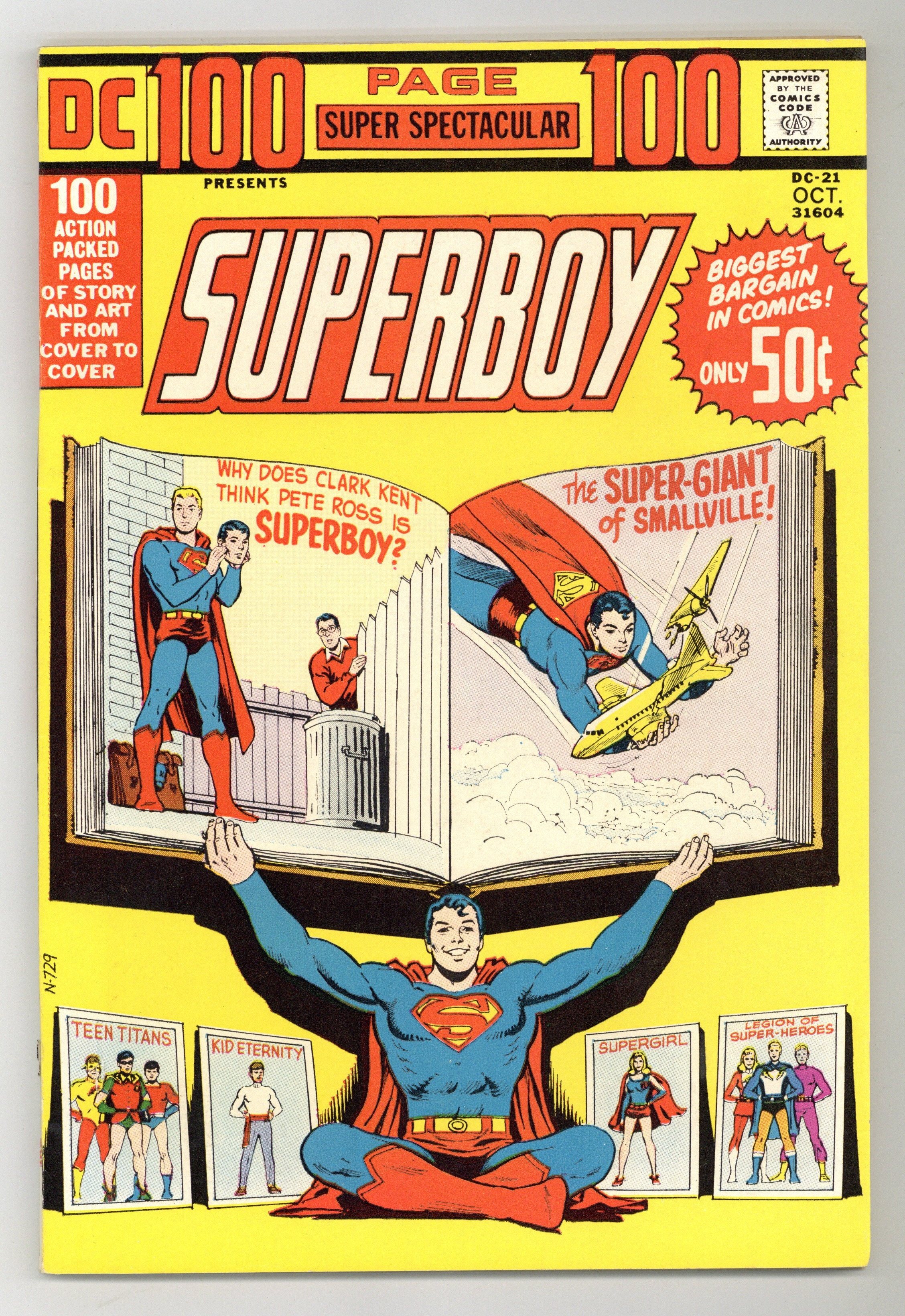 $24.00Superboy stars in "The Superboy Revenge Squad!" Originally presented in Superboy #94, art by George Gapp. Supergirl's friend Lena Thorul learns she is the sister of the sinister Lex Luthor in "Lena Thorul, Jungle Princess!" Originally presented in Action Comics #313, art by Jim Mooney. Kid Eternity battle the Beagle. Originally presented in Kid Eternity #9. Plus, reprints of Adventure Comics #332 by Edmond Hamilton and John Forte, Brave and the Bold #54 starring the Teen Titans (Robin, Kid Flash, and Aqualad), and Superboy #50 by Otto Binder, Curt Swan, and George Klein. Cover price $0.50.