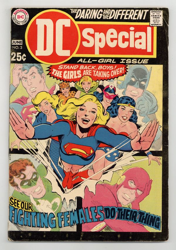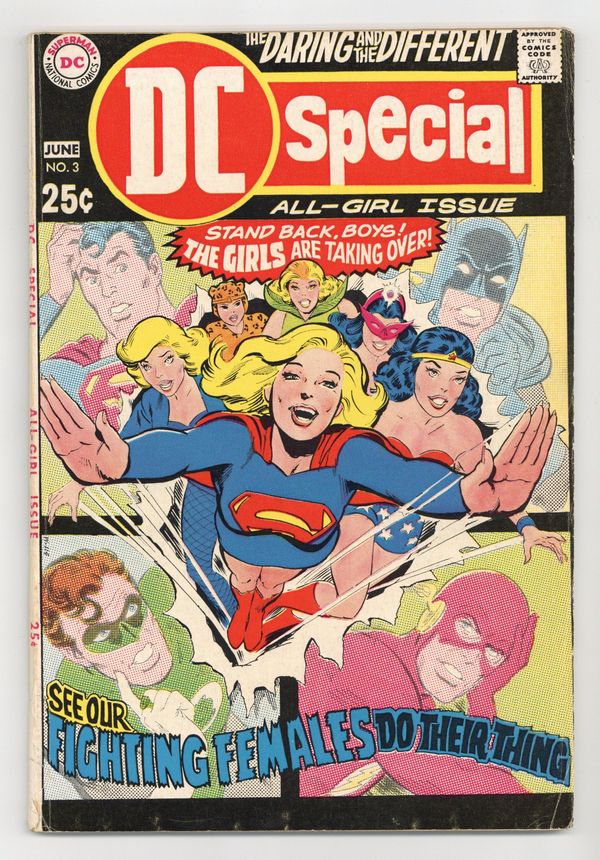 All-Girl issue. Previously unpublished Golden Age Wonder Woman story, "The Cheetah's Thought Prisoners!" Reprints include Supergirl in "The Maid of Menace!" (art by Jim Mooney); the Black Canary in "Special Delivery Death!"; a science fiction story, "Girl in the Golden Flower!" (script by Robert Starr; pencils by Carmine Infantino?); and Green Lantern in "The Secret Life of Star Sapphire!" (pencils by Gil Kane). One-page text feature, "Fact File #6" on Sargon the Sorcerer. Neal Adams cover inks? Cover price $0.25.