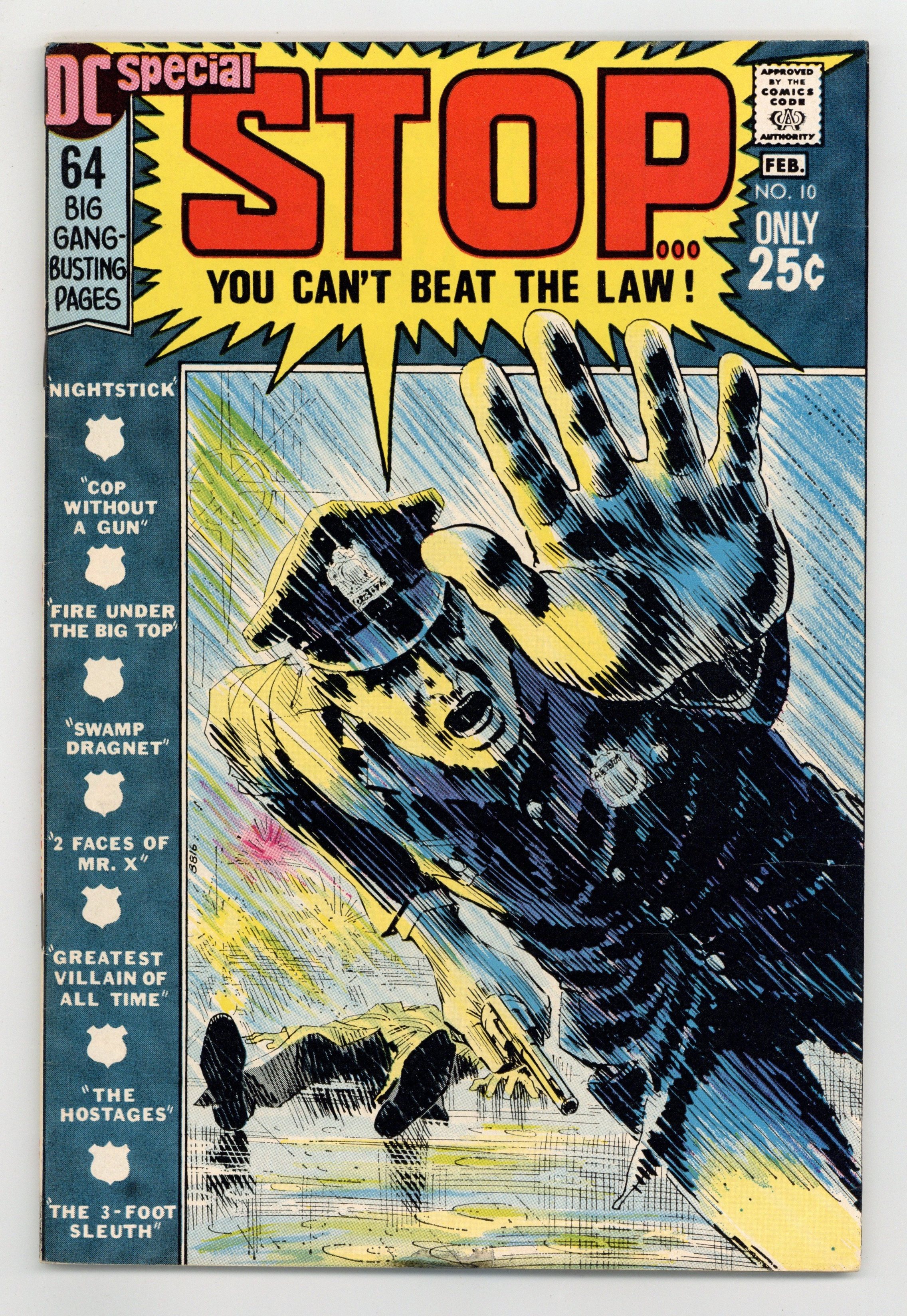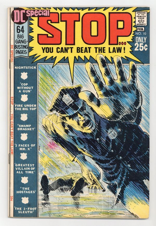 Stop...You Can't Beat the Law! 64 big gang-busting pages. Featuring: 6 page reprint story "Nightstick" drawn by Curt Swan and Ray Burnley; 6 page reprint story "The Three-Foot Sleuth!" drawn by Joe Maneely; 6 page reprint story "The Cop without a Gun" drawn by Ruben Moreira; 8 page reprint story "The Greatest Villain of All Time" drawn by Mort Meskin; 8 page reprint story "The Hostages" drawn by Curt Swan and Ray Burnley; 7 page reprint story "The Two Faces of Mr. X" drawn by Curt Swan and Leonard Starr; 8 page Fireman Farrell reprint story "Fire under the Big Top" written by Arnold Drake and drawn by John Prentice; 6 page reprint story "Swamp Dragnet" drawn by Nick Cardy. Cover by Nick Cardy. Cover price $0.25.