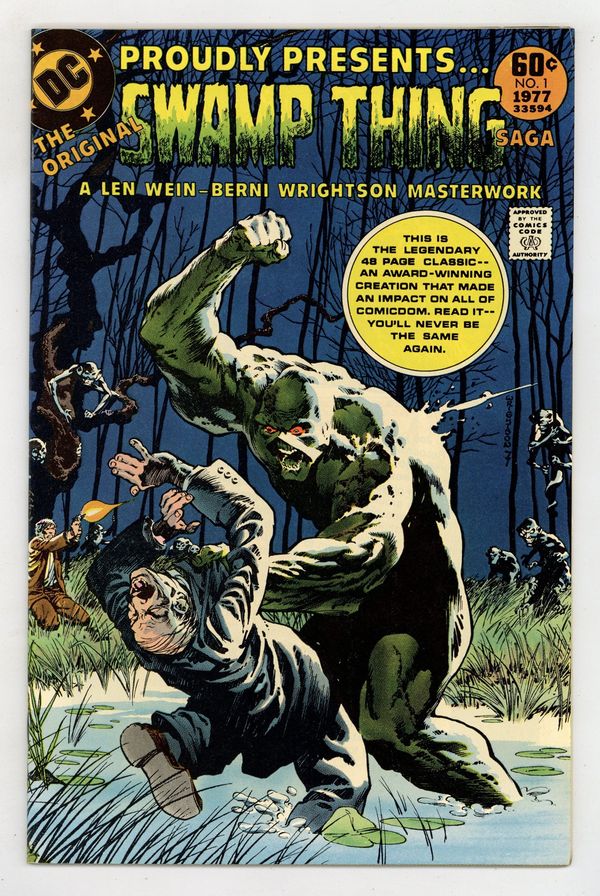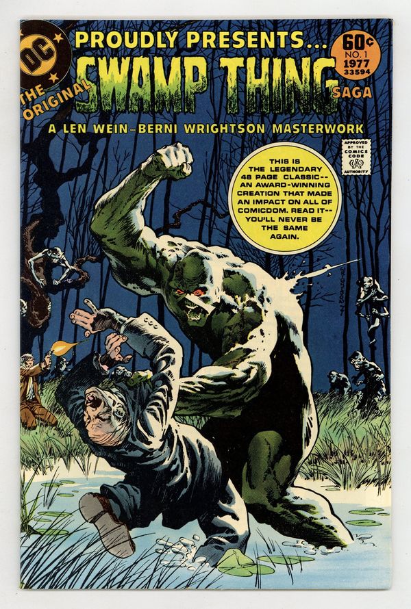 Tags: Hero/Villain Teams$19.25Swamp Thing Berni Wrightson reprints. 1977 issue: Title on cover of comic reads: The Original Swamp Thing Saga. NOTE: This issue, #2, has a #1 on cover--very confusing as neither the cover title nor the issue number match the actual series and number! Cover price $0.60.