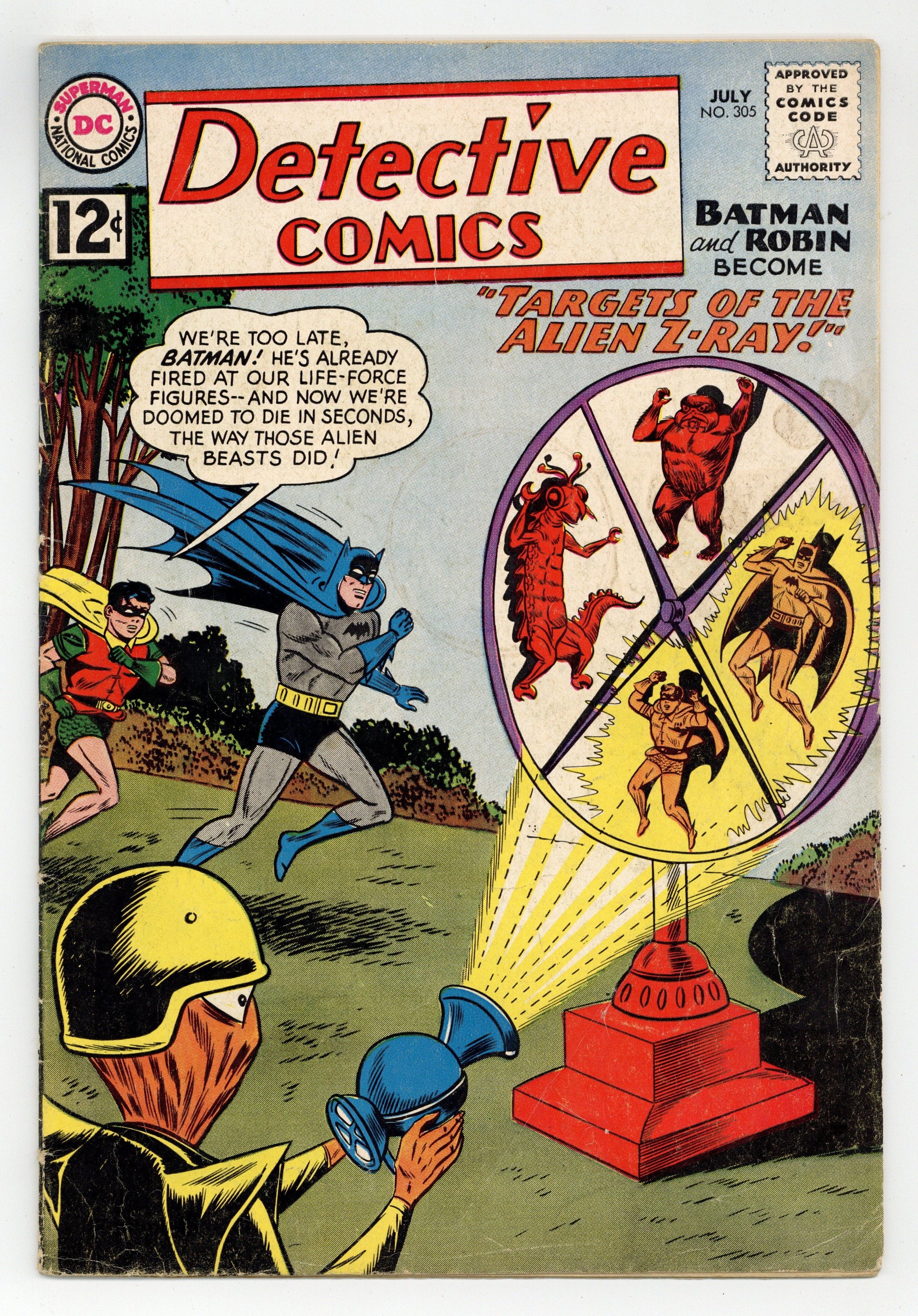 Cover art by Sheldon Moldoff. "Targets of the Alien Z-Ray" starring Batman and Robin, pencils by Sheldon Moldoff, inks by Charles Paris; Two bank robbers force two aliens on Earth to give them the secrets of a Z-Ray, which kills by delayed action, and use it against Batman and Robin; However, the alien tricks the crooks by altering the killing ray making it harmless, so that the Dynamic Duo could capture the criminals, who become overconfident using the alien weapon; After the crooks are captured, the aliens return to their home planet. Warden Willis humor page by Henry Boltinoff. J'onn "J'onzz Vs. Futureman" starring John Jones Manhunter from Mars, art by Joe Certa; A future policeman traces a Martian criminal back to the 20th century and mistakes the Manhunter for his quarry. Be a Good Citizen! public service announcement starring Superman, script by Jack Schiff, art by Sheldon Moldoff. Strange Laws humor page by Henry Boltinoff. 36 pgs., full color. Cover price $0.12.