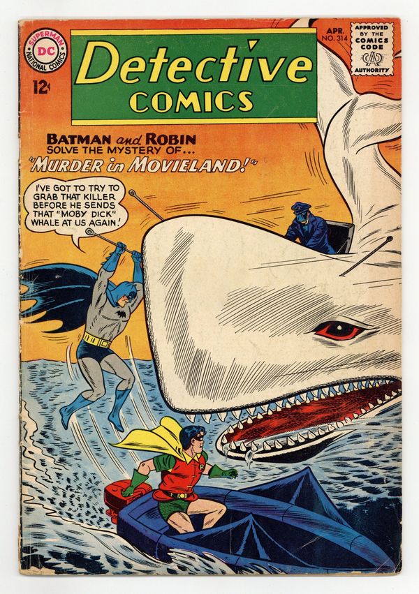 Cover art by Sheldon Moldoff. Murder in Movieland starring Batman and Robin, pencils by Sheldon Moldoff, inks by Charles Paris; Batman and Robin try to nab a disgruntled actor before he can murder three movie studio heads while reprising some of his greatest screen roles; The actor almost succeeds in killing his victims, but they are all saved by Batman; However, some evidence comes to light that might prove that the actor is in fact innocent and that somebody is trying to frame him; Batman investigates further and gathering enough clues, he deduces the place where the criminal would strike next; Batman once again prevents the man from murdering and finally learns that he is in fact the actor and that the previously uncovered evidence was placed by the man, in order to throw away suspicion. Salute to Our Fellow Citizens of Puerto Rico! public service announcement, script by Jack Schiff, art by Sheldon Moldoff. "J'onn J'onzz vs. John Jones" starring John Jones Manhunter from Mars, art by Joe Certa; A Saturnian criminal disguises himself as Jones, not realizing he's the Manhunter. Don't Shoot - I Surrender! Article. 36 pgs., full color. Cover price $0.12.